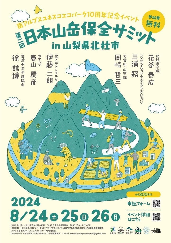 山梨県北杜市(市長:上村英司)と一般社団法人北杜山守隊(所在地:山梨県北杜市 代表理事:花谷泰広)は、南アルプスユネスコエコパーク登録10周年を記念して、山岳保全に関する課題を多くの方と共有し、山岳資源を将来に引き継げる仕組みづくりを目指すため、令和6年8月24日(土)から8月26日(月)の3日間、「第2回日本山岳保全サミットin北杜」を開催しました。
