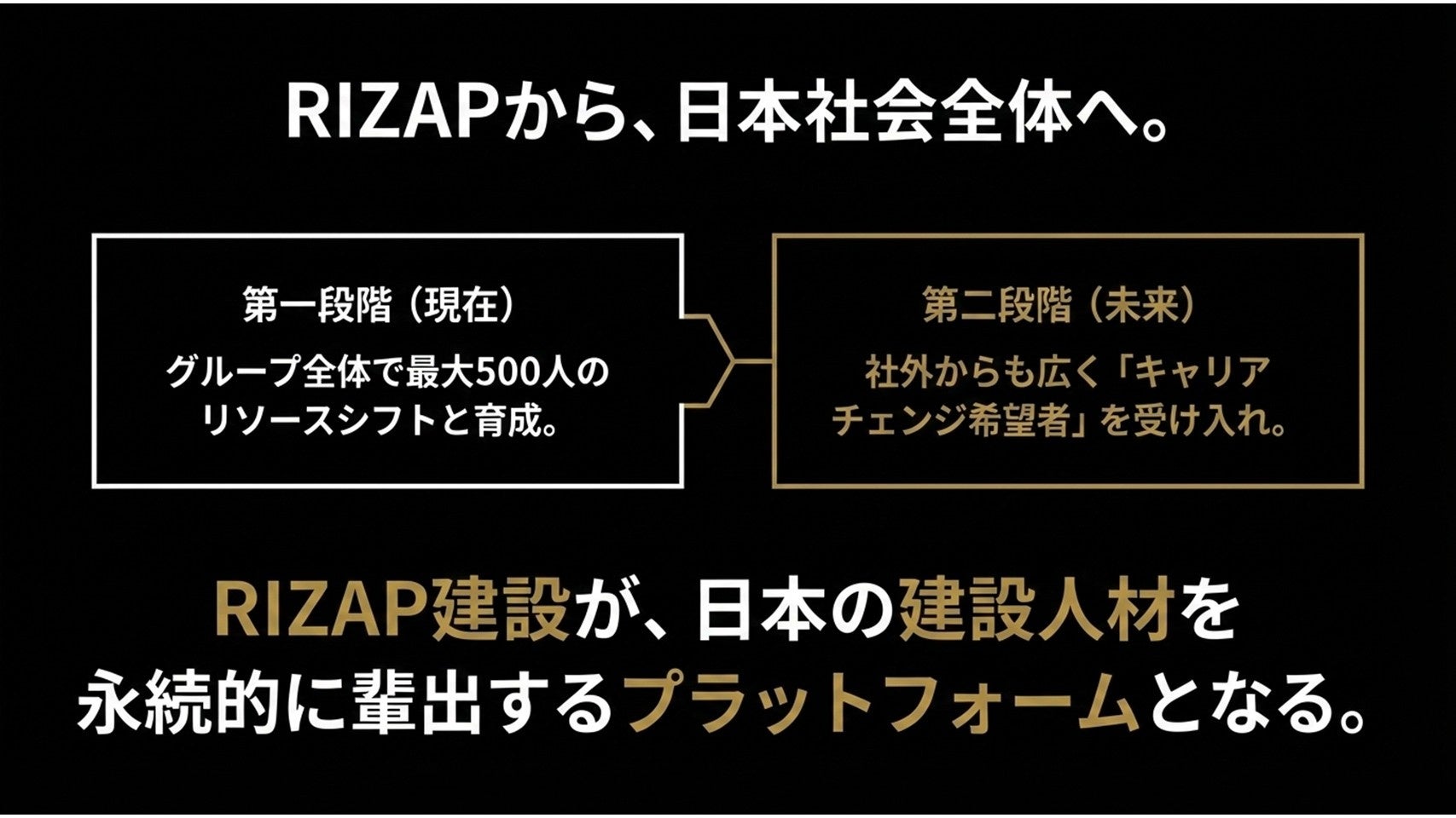 ・500人の専門人材創出: AI活用により捻出された最大500人の人的リソースへリスキリング機会を提供(技能・資格取得の全面支援)、RIZAP建設へリソースシフトを計画しています