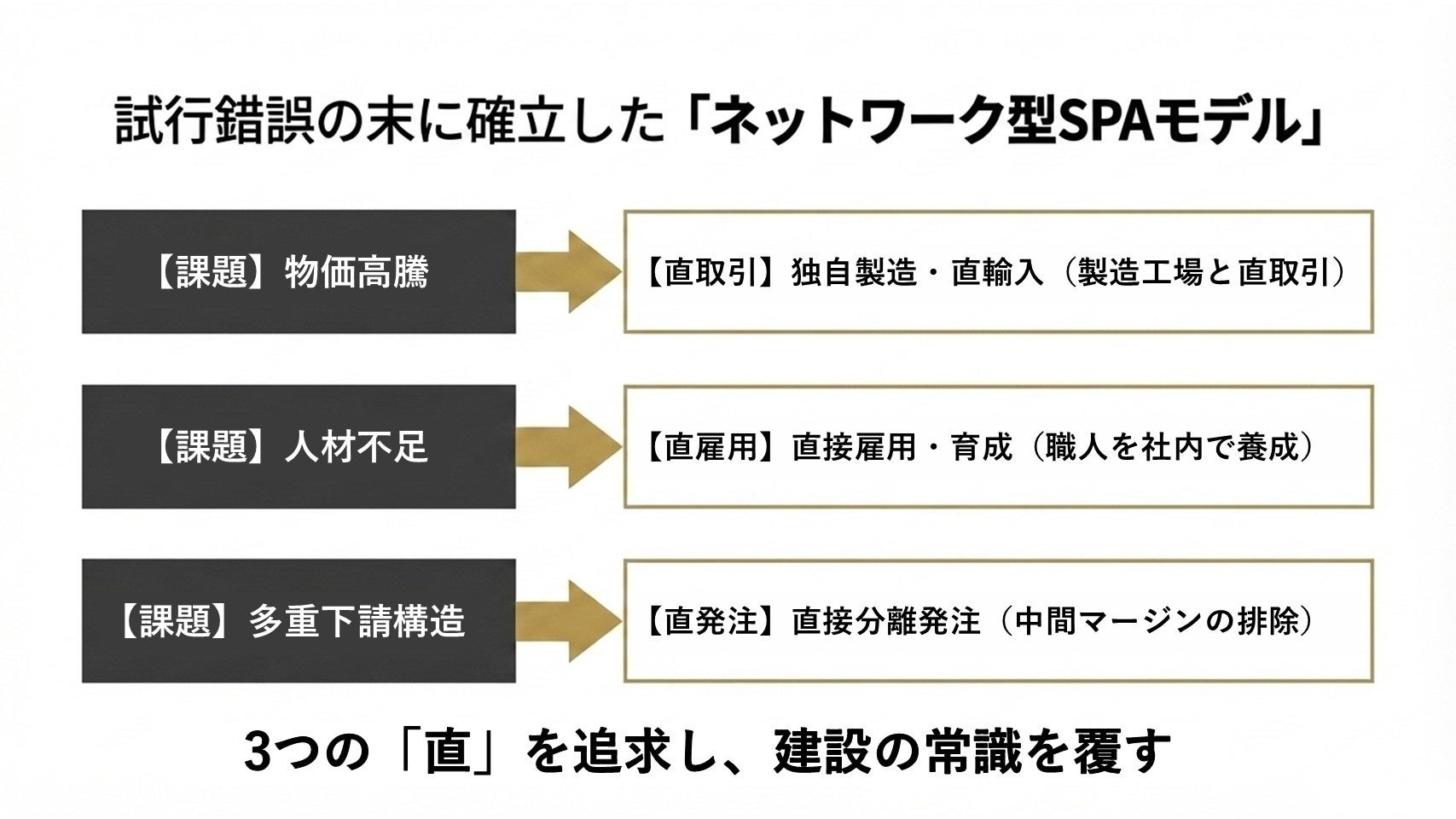 ・直発注(直接分離発注): 従来の多重下請構造から脱却し、中間マージンを徹底排除