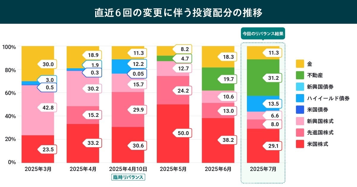 ※上記投資配分について、2025年3月は3月3日、2025年4月は3月28日、2025年5月は4月30日、2025年6月は5月29日、2025年7月は6月27日のそれぞれの変更時点の比率を示しています。2025年4月は、通常の変更に加えて4月10日に臨時リバランスを実施しました。