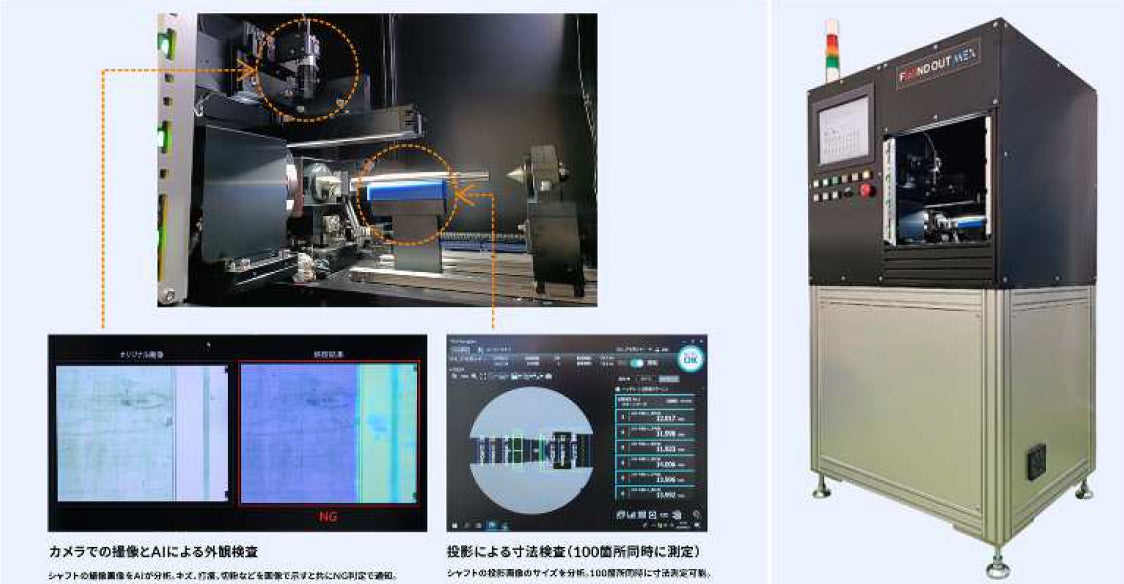 F[ai]ND OUT(ファインドアウト)MEX TYPE-Sは、シャフト検査をはじめ、金属製品に特化したAI検査装置です。投影による寸法検査(最大100箇所同時に測定)と外観検査をワンパッケージし、製造現場の省人化・省スペースと高品質保持を実現する画期的な製品です。 (https://www.yuasa.co.jp/solutions/faindout-mex/)