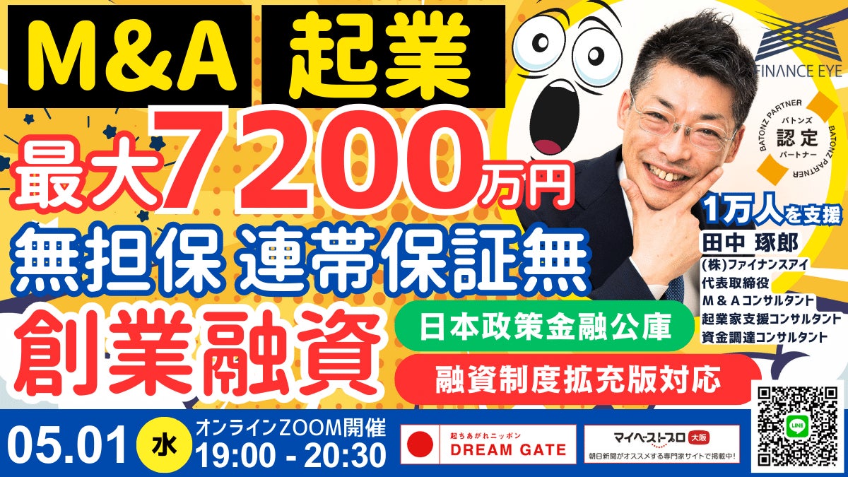 株式会社ファイナンスアイ(所在地:大阪市、代表:田中琢郎)は、日本政策金融公庫が2024年4月1日に発表した、社長の個人連帯保証無しの無担保無保証で最大7200万円のスタートアップ・起業家向けの融資支援制度の拡充に対応した、M&A起業を考える起業家・M&A買収・中小企業の経営者に向けて特別なセミナーを開催いたします。「M&A起業やM&A買収にも使える。社長の個人連帯保証無し!無担保で最大7200万円!日本政策金融公庫の新規開業資金(創業融資)はコレで解決!落とし穴にハマらないための融資審査の本音と建前〜1万件以上を支援したファイナンスアイ田中琢郎社長だから分かるリアルを伝える」(※参加者の顔出しナシ)と題したこのセミナーでは、田中社長自らが、1万人以上の起業家や経営者の融資を支援した実体験をもとに、M&A起業やM&A買収資金にも使えて、創業期の有力な資金調達手段である創業融資を成功させるポイントを分かりやすくお伝えします。本セミナーは、平日夜の2024年5月1日(水)19:00より、オンラインでZOOMを使用して実施されます。コロナ禍を乗り越え、億超えの起業家を生み出し続けたファイナンスアイが、良い案件も悪い案件も1万人以上をリアルに支援したから分かる融資審査の本音と建前、M&Aのオカネとリスクの解決策を分かりやすく伝えます。セミナーでは田中社長とライブで質疑応答ができるので厳格化する融資審査を乗り越えるために具体的なアドバイスが欲しい人はチャンスです。このセミナーを受講すれば、あなたのビジネスもファイナンスの力を活用して成功の軌道に乗ることができるでしょう。会社の未来のオカネをクリエイティブする事がファイナンスです。
