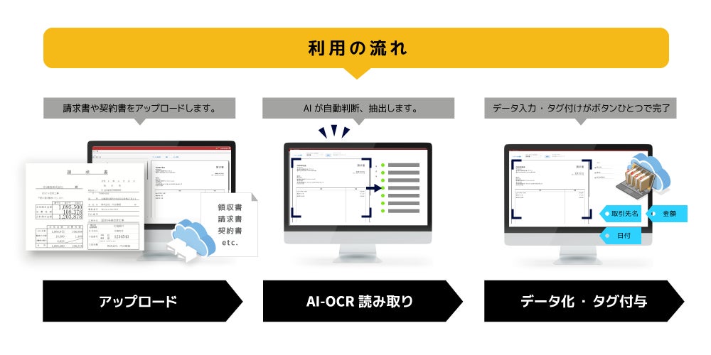 提供を開始する「UC+(ユクタス)スキャン」は、請求書など取引関係書類のPDFデータをAI-OCRで読み取り、文書内の項目と値を文字認識しデータとして利用することができます。AIが項目名と値を類推して読み取るため、マスタ設定なしで様々な帳票に対応可能です。