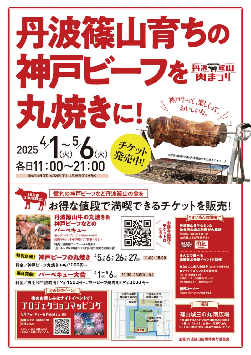 丹波篠山国際博実行委員会は、特産品振興イベントとして2025年4月1日~5月6日(一部月曜日除く)まで、篠山城三の丸南広場で「うまいもんお城横丁」(以下本イベント)を期間限定にて開催します。このメイン企画は、城内の桜や篠山城の景観を堪能しながら神戸ビーフと黒毛和牛の食べ比べや、世界で唯一の神戸ビーフの丸焼きを楽しむことができるバーベキュー大会です。地域の名店や神戸の名店など41店が日替わりで、丹波篠山産の食材をもちいた料理をご提供します。丹波篠山国際博のオープニングイベントとして実施されるお城のプロジェクションマッピングと共にお楽しみいただけます。