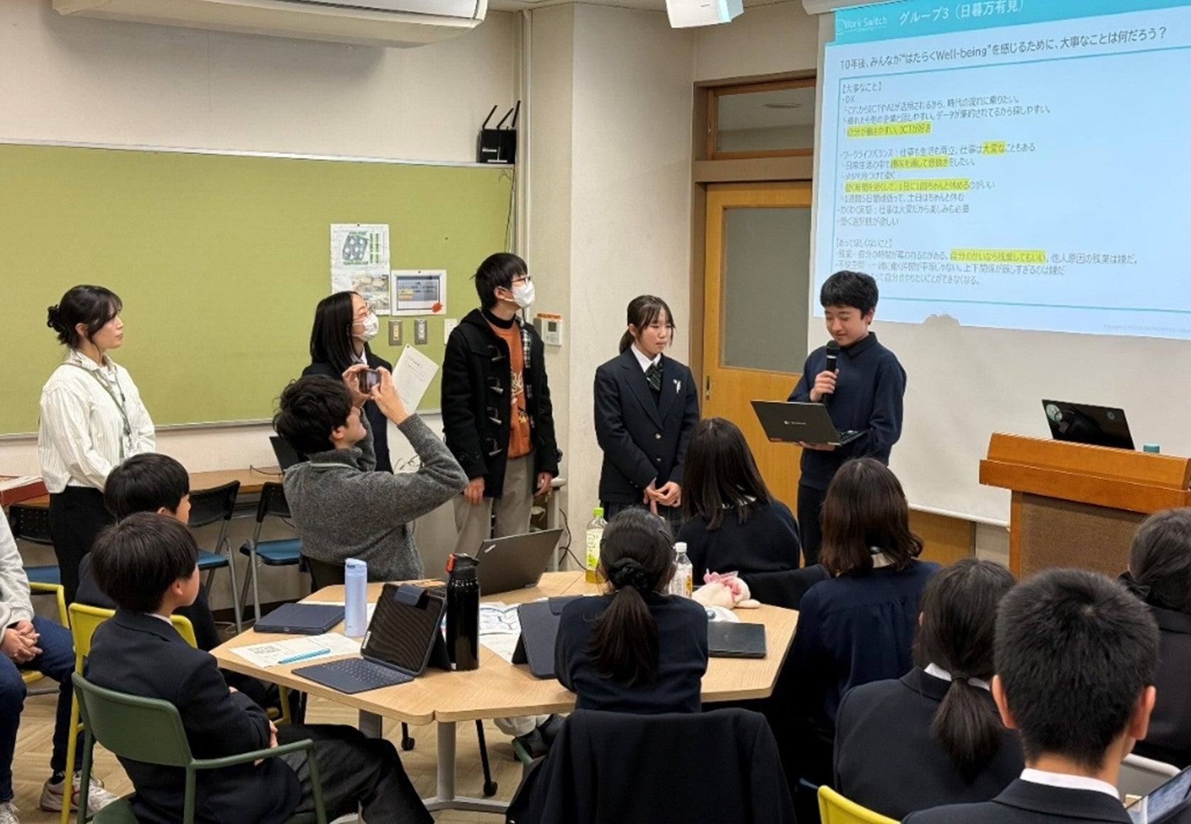 「10年後、みんながWell-beingにはたらくために大事なことは?」という問いに対し、各班の発表からは中学生ならではの素直さと、社会課題を鋭く捉えた視点が飛び出しました。