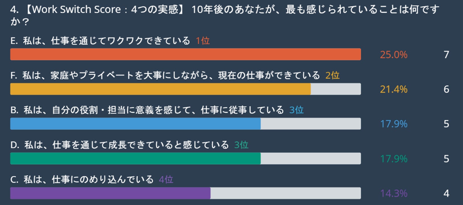 「10年後、最も感じていたいこと」として「仕事を通じてワクワクできている」が25.0%でトップとなりました。次いで「家庭やプライベートを大事にしながら、現在の仕事ができている(21.4%)」が続き、仕事への熱量と生活の充実の両立を求めていることがわかります。