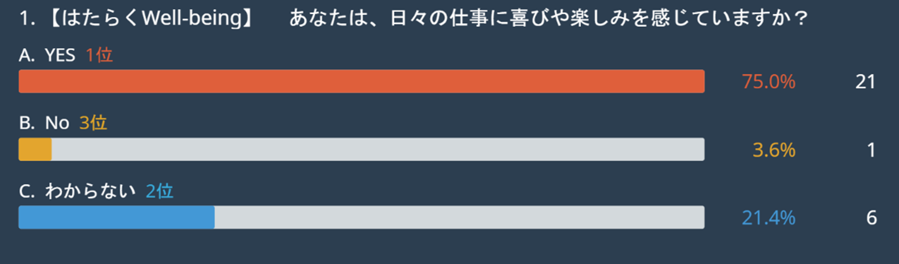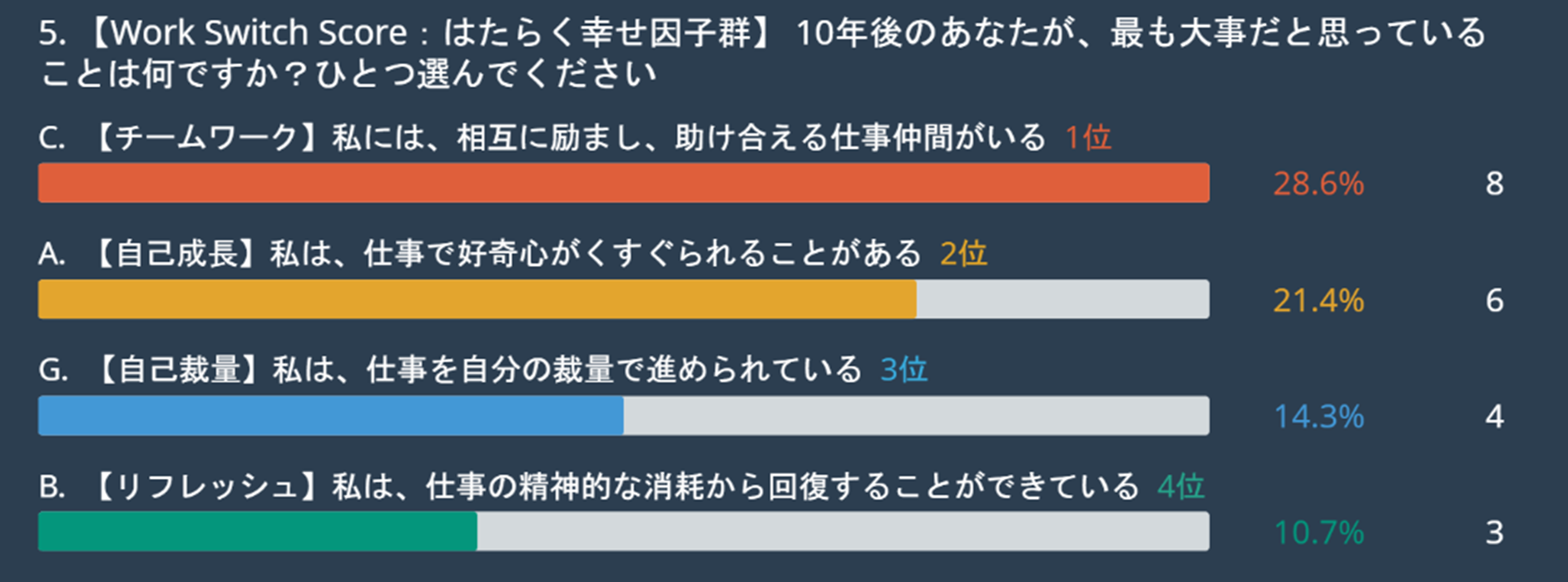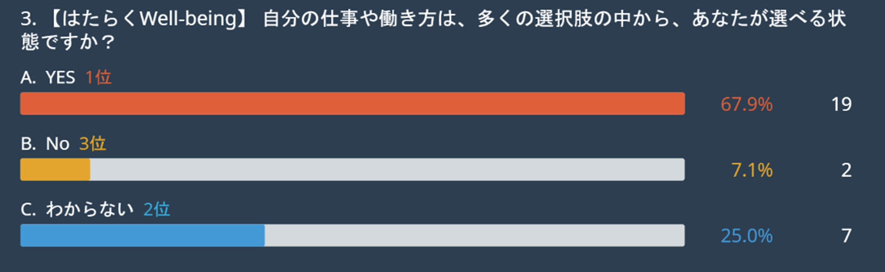 「自分の仕事や働き方は自分で選べる状態か(自己決定)」という問いに関しては、「YES(67.9%)」が最も高い結果となりました。他設問のはたらく幸せ因子の第3位にも「仕事を自分の裁量で進められている(14.3%)」が入っており、仕事の内容だけではなく、時間の使い方も含めて「自分でコントロールできている状態」を強く求めていることがわかります。
