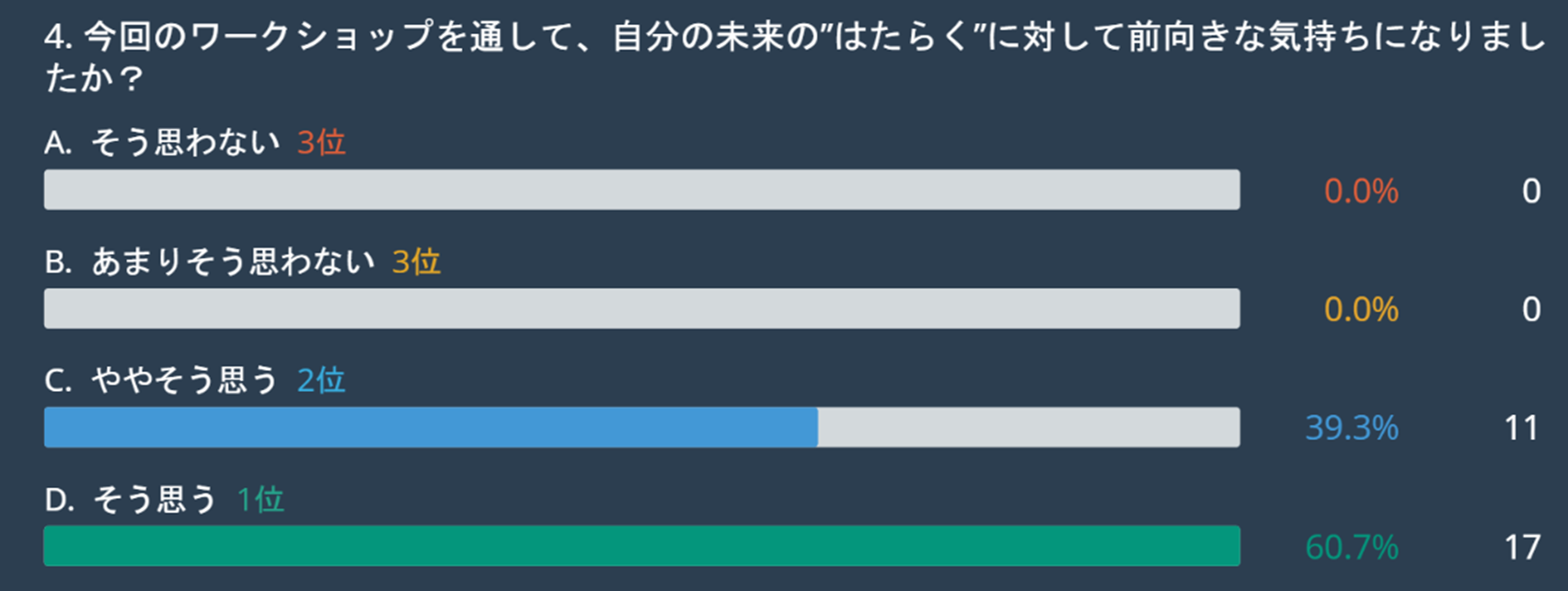 本ワークショップに参加した生徒たちに対する「日々の仕事に喜びや楽しみを感じていますか?」という問いでは、「YES(75.0%)」が最も高い結果となりました。生徒たちの多くが仕事にポジティブな感情を見いだしており、「仕事=喜びや楽しみを感じられる場」という価値観が広がっていることがわかります。
