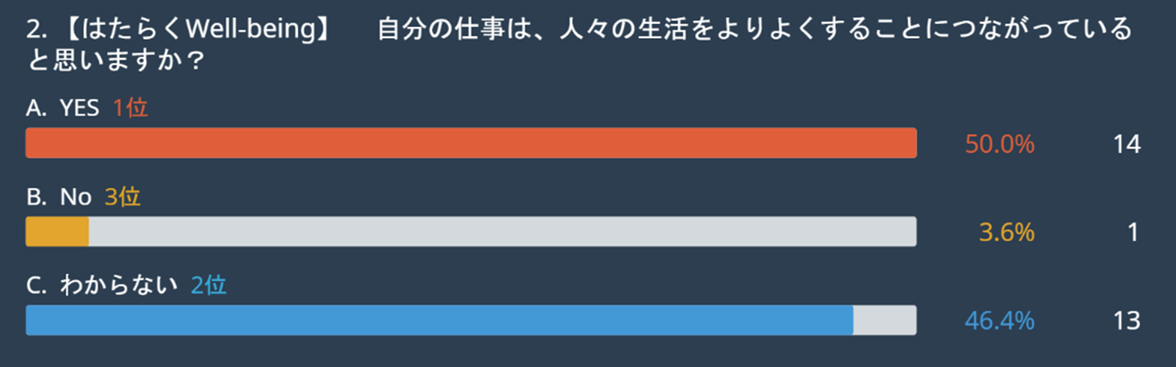 「自分の仕事は人々の生活をより良くしているか(貢献)」という問いに関しては、「YES(50.0%)」が最も高い結果となりました。他の設問では、はたらく環境因子の第2位に「所属会社の目指している理念や存在意義は、自分自身のはたらく意義と共通している(17.9%)」がランクインしていることから、単にタスクとして仕事をこなすのではなく、自分の価値観と組織の目指す方向性が一致していること(=意味のある貢献)を、10年後のはたらく環境として重要視していることがわかります。