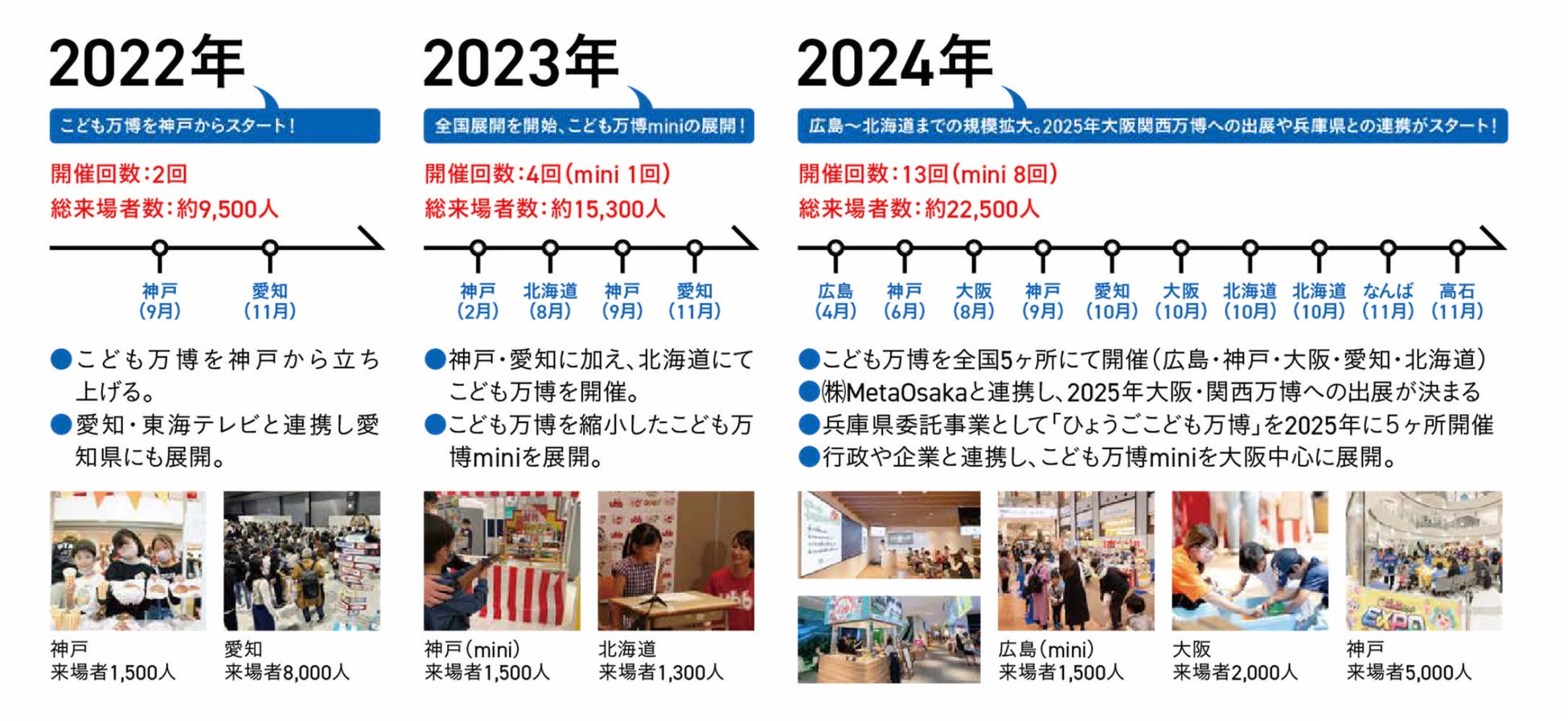 「こども万博」は2022年、コロナ禍により子どもたちの行動が制限される中、実行委員長 手塚麻里の自宅の1室で12人の子どもたちと描いた128個の夢から始まりました。 2024年までに、大阪、神戸、愛知、北海道、広島など7都市で開催し、累計約5万人を動員。 地域に根ざした活動から全国規模へ、さらに2025年10月「EXPO2025大阪・関西万博」という国際的な舞台へ発展します。