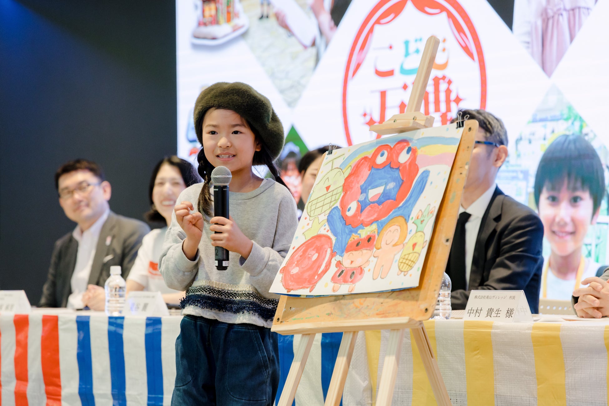 あやはさん(8歳)は、「イラストレーターになりたい」という夢を発表。会場に絵を持参し、カラフルに描かれたキャラクターを一つ一つ丁寧に説明しました。中央には大阪・関西万博の公式キャラクター「ミャクミャク」を描き、「難しかったけどいい感じに描けた」と誇らしげに話しました。