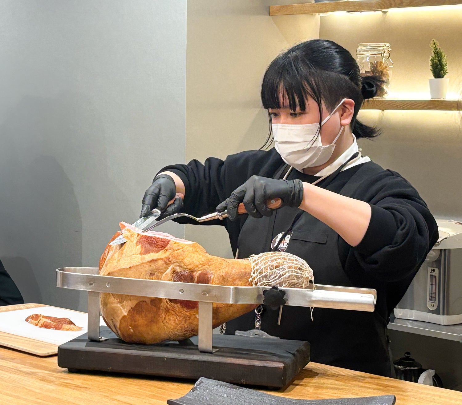 その後、ニュー・クイック自慢の骨付きハムの切り出しを目の前で実施。切りたてのハムを試食する贅沢な体験からイベントがスタートしました。