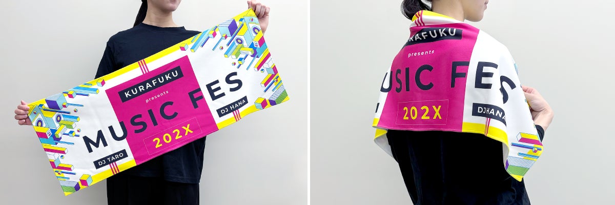 マフラータオルタイプは細身のタオルで、肩に掛けたり首に巻いたりしやすく、ライブや応援グッズにおすすめです。汗をかいても首元を快適に保ちます。