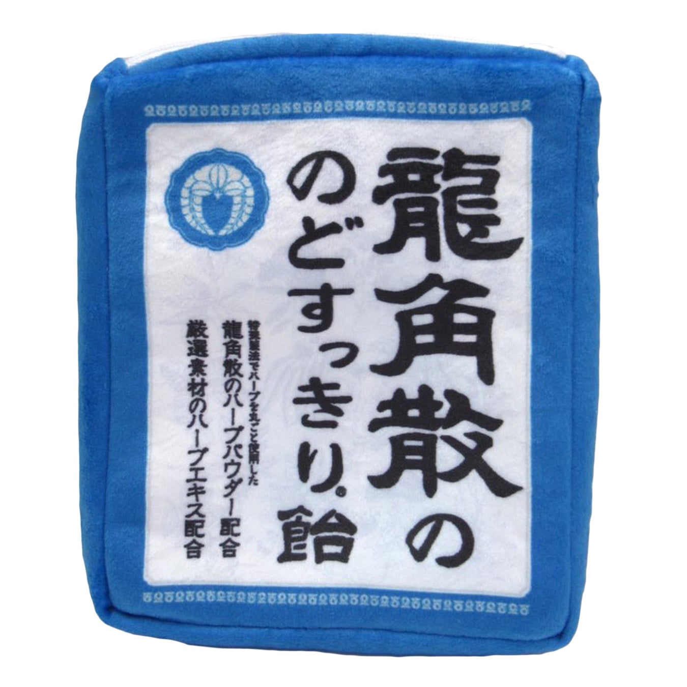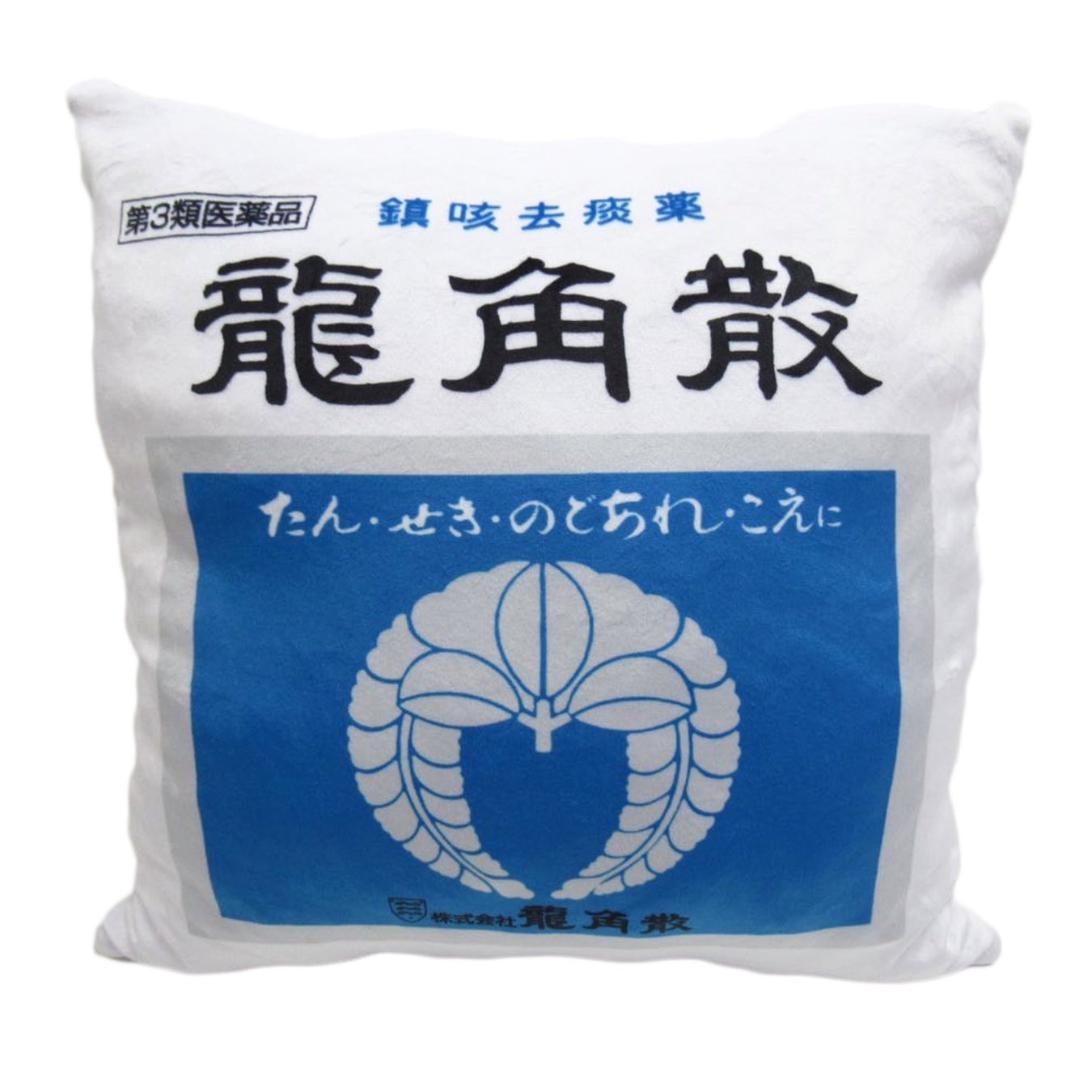「龍角散」のパッケージデザインのクッションは、四角い箱型と丸い缶型がリバーシブル!その日の気分に合わせて使い分けができます。