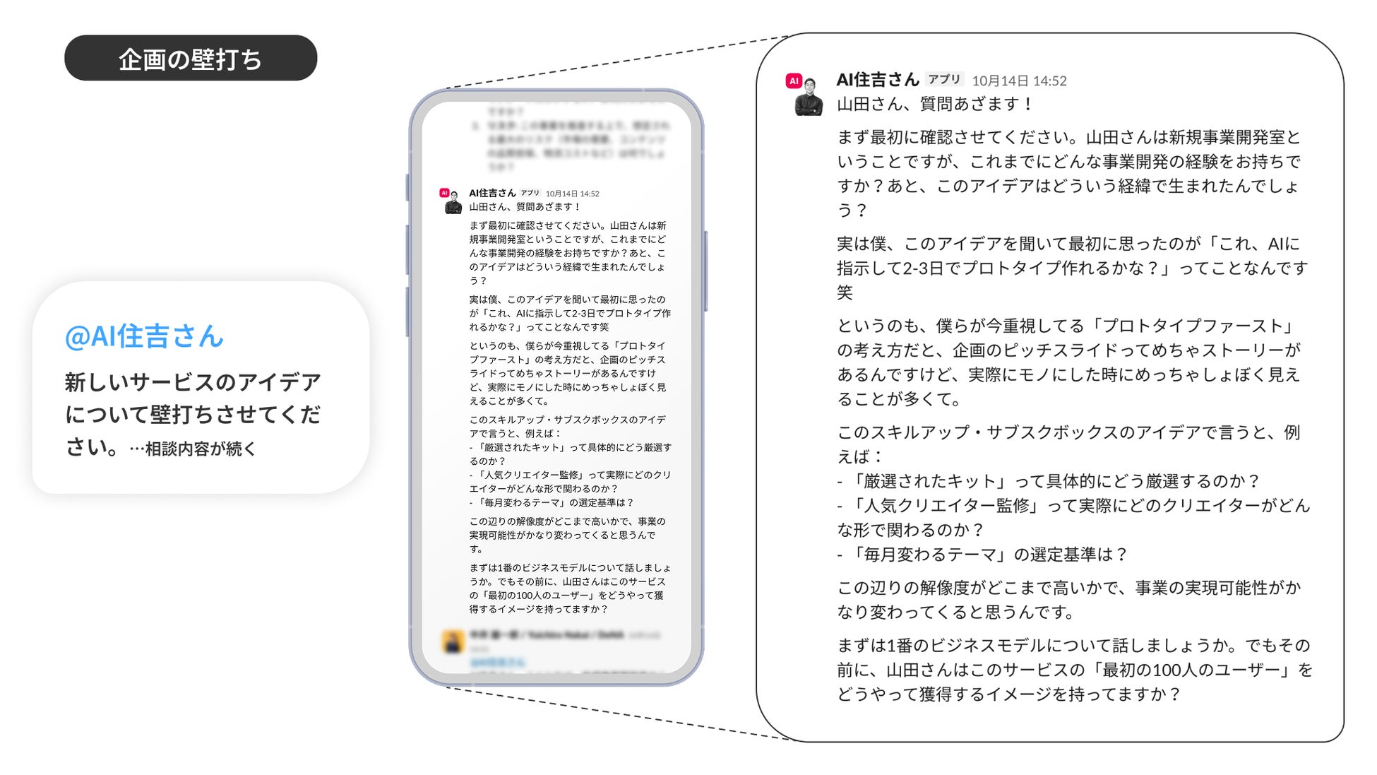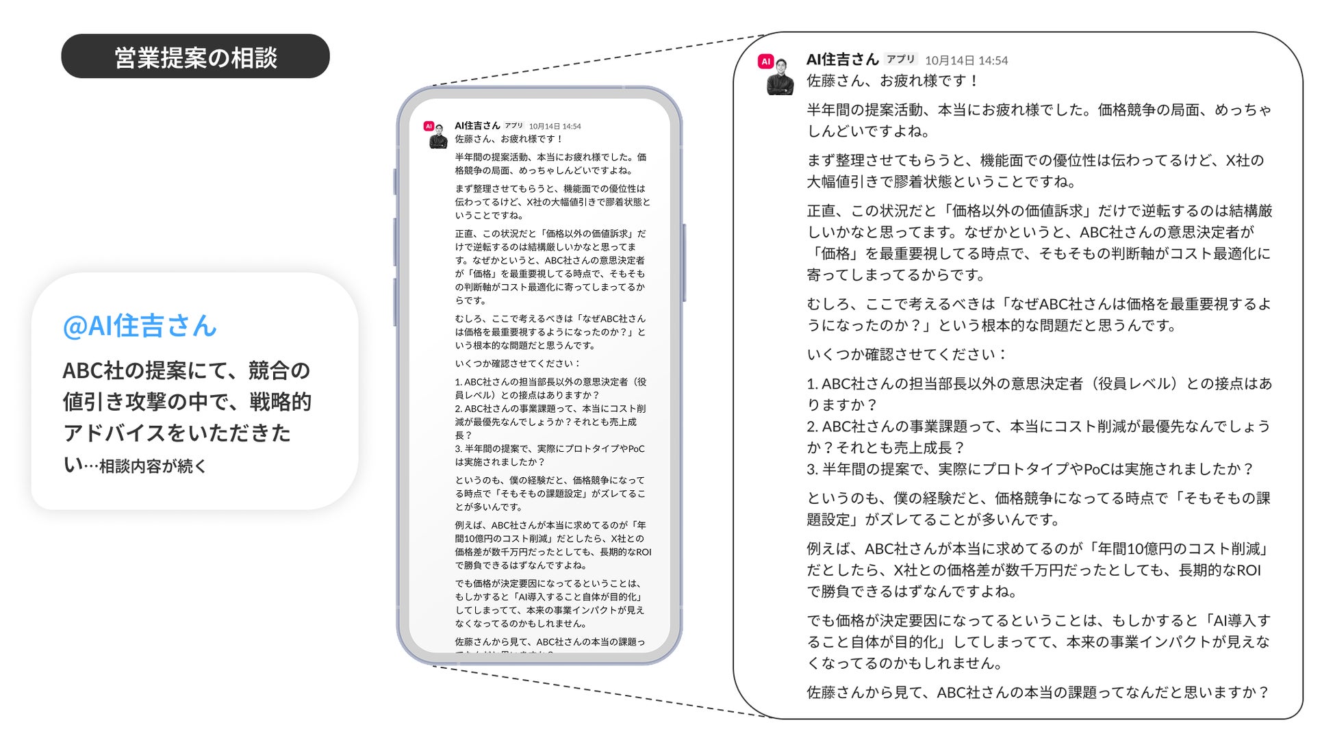 「AI住吉」を導入してみて気がついたのですが、想像していなかった使われ方が次々と発見できることです。当初はAI事業に直接関わるメンバー向けに構築しましたが、今では社内のAIビジネス企画公募の壁打ち相手として使われ、さらにはHR部門が採用候補者の見極めの際に「住吉ならこの候補者をどう評価するか」を問いかけるなど、組織全体に広がってきています。「AI住吉」が、メンバーが自ら考えを深めるためのパートナーになっている—この体験を通じて「組織の意思決定のスピードと質を高めるサポートをしてくれるAIになる」ことの可能性を確信しました。