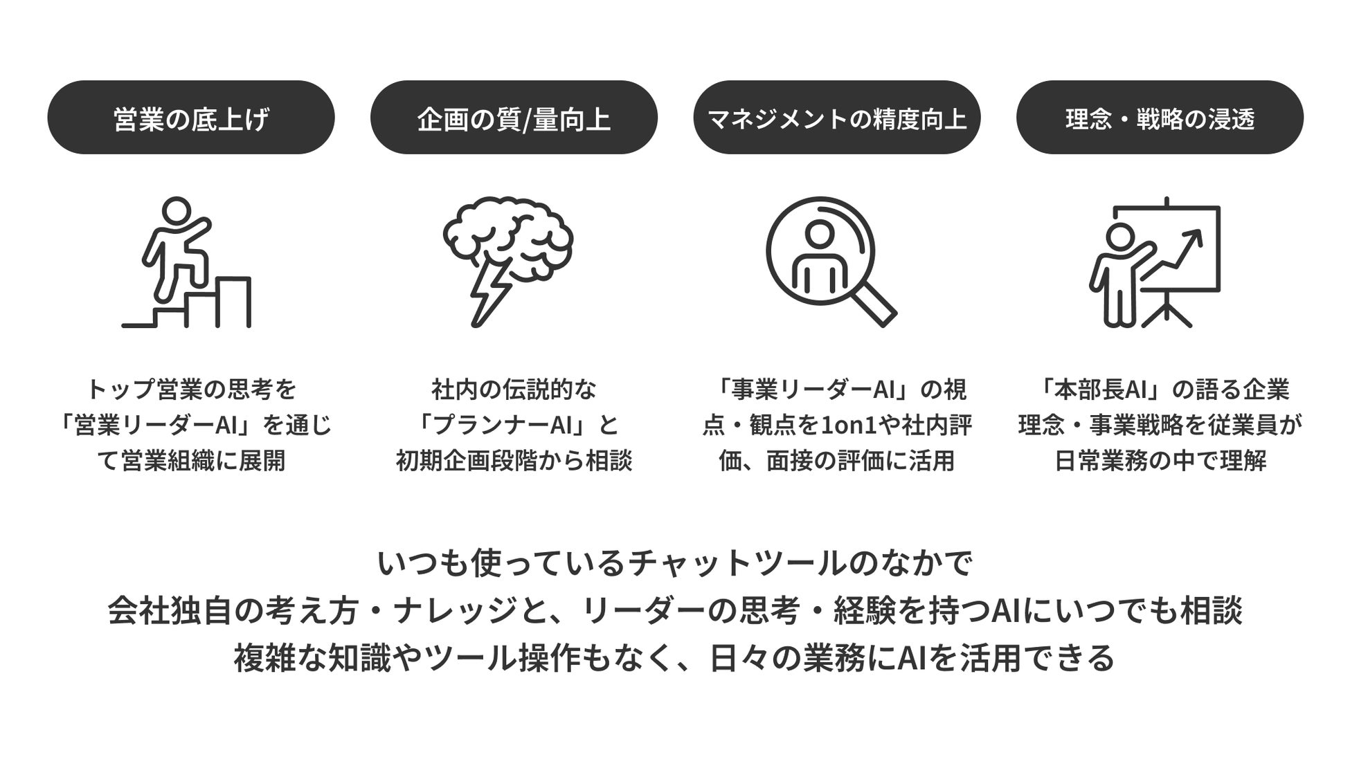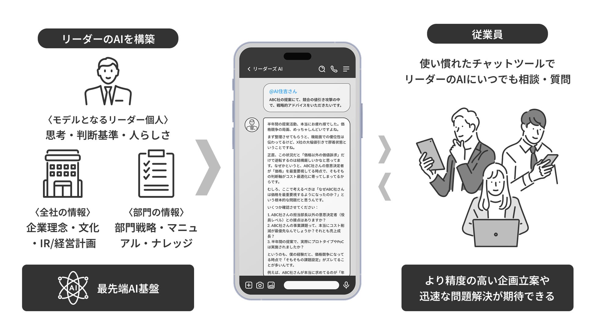 今回の合意に基づいて共同開発する「リーダーズAI」は、経営層に加えて、企業内の事業リーダー、営業・企画・販売・開発等の各部門において企業を牽引しているリーダーの思考をAI化し、“理想のリーダー”を創り、育て、活用を深めていくAIサービスです。