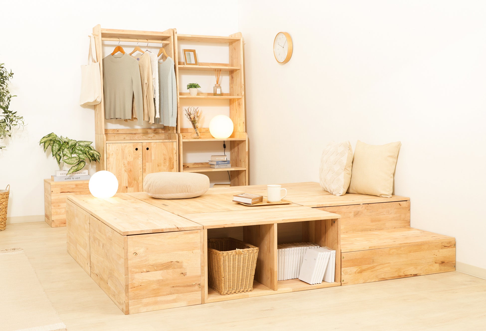 木の温もりを存分に感じられる天然木の家具シリーズ「Natural Signature」に新商品が登場しました。オープンシェルフやベンチなど自由な組み合わせでスキップフロアや掘りごたつなどをつくることができます。リフォームをせずに憧れの生活スタイルを手に入れることができる点が魅力です。天然木ならではの優しい風合いや木目の個性が空間に温もりを与え、家族や友人が自然と集まる居心地の良い場所を作り出します。またモジュール式の設計により、スペースやライフスタイルに合わせて自由自在にレイアウトを変更可能。引っ越しや模様替えにも柔軟に対応できるため、長く愛用していただけるシリーズです。