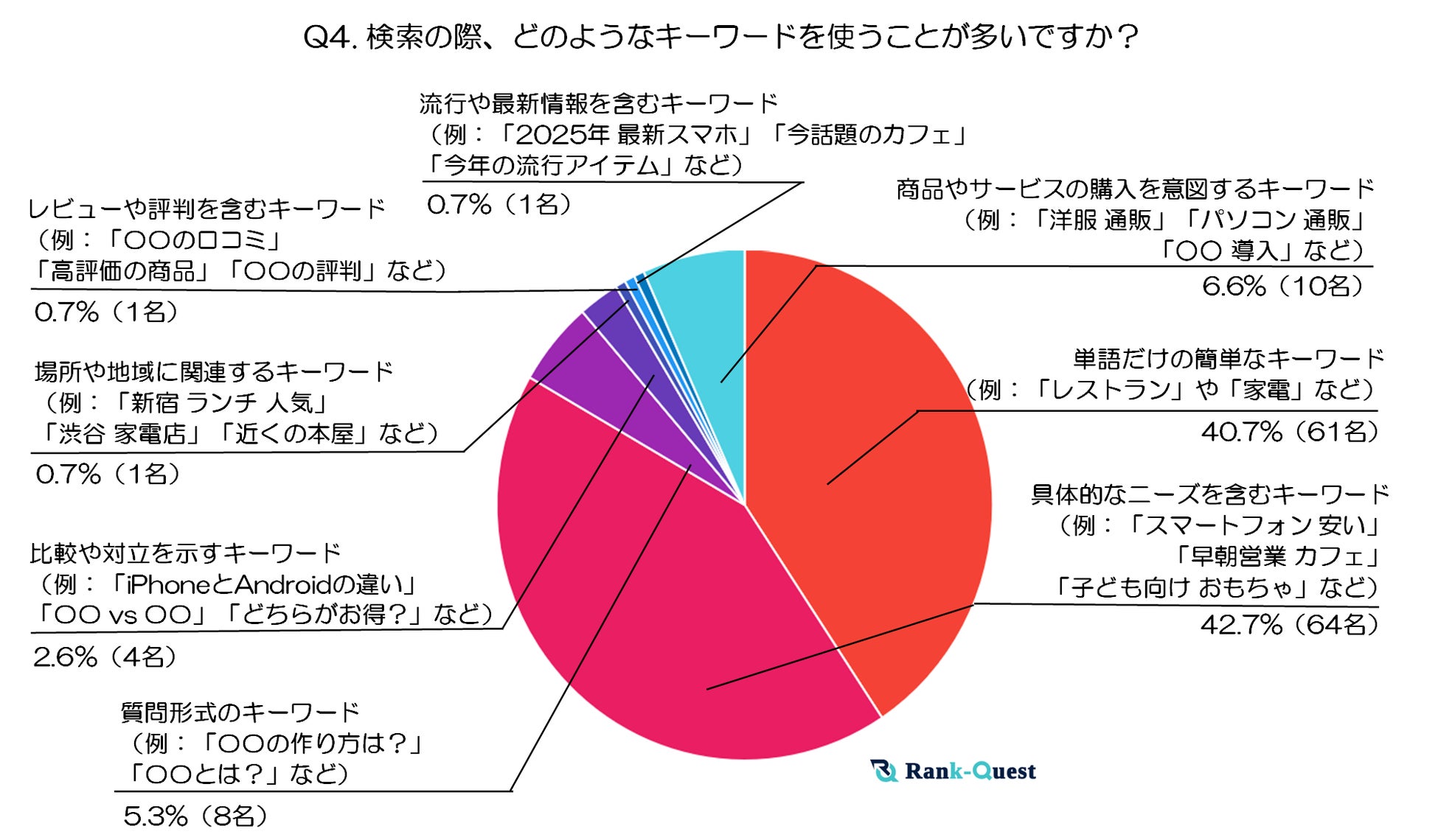 次いで多かったのは「単語だけの簡単なキーワード」で、40.7%を占めました。忙しい40代はまず短いキーワードで検索結果をざっと確認し、必要に応じて詳細を深掘りするスタイルが定着しているようです。
