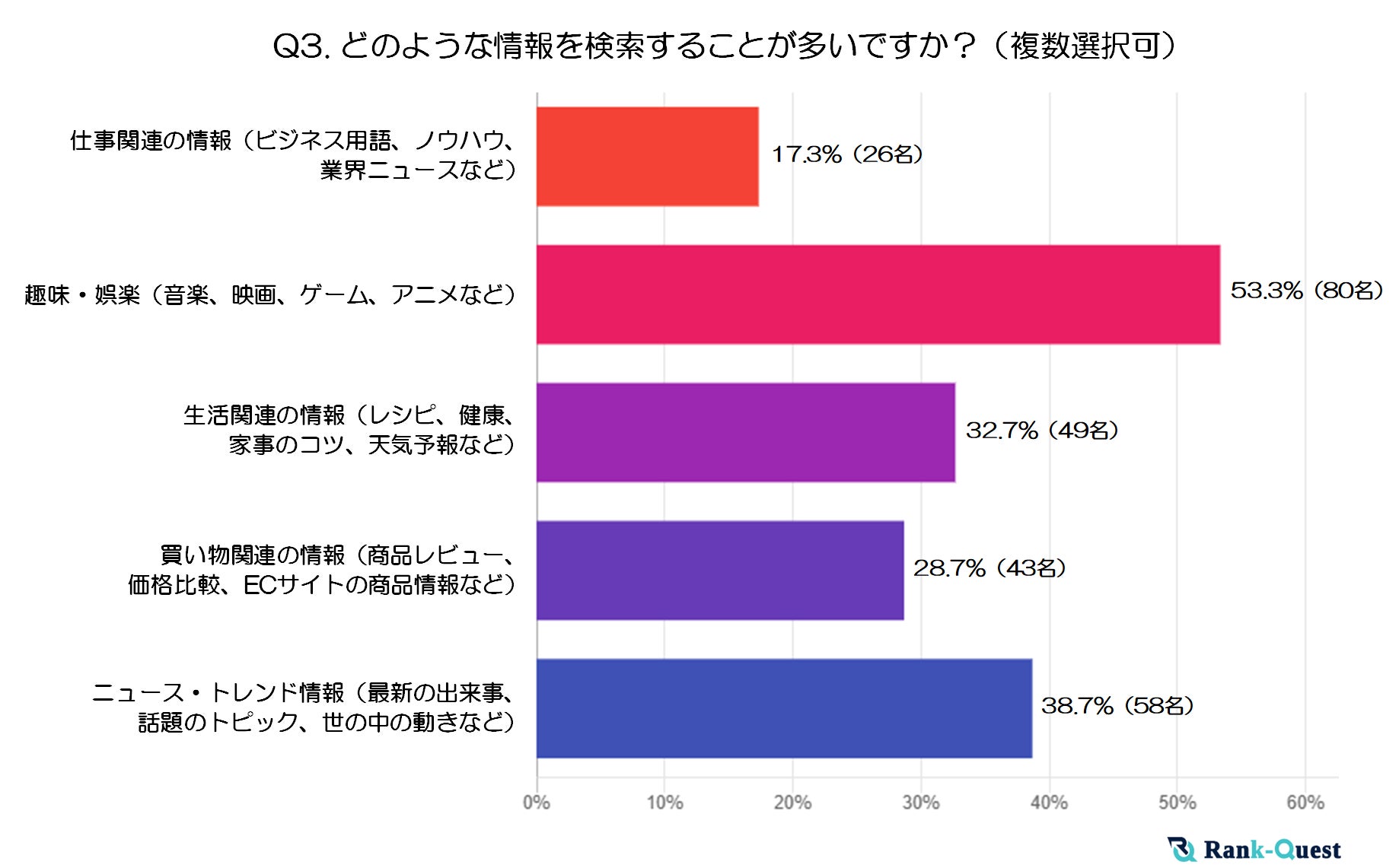 さらに、検索トピックは娯楽・趣味(53.3%)やニュース・トレンド(38.7%)、生活関連といった幅広いジャンルに及び、仕事や家庭の忙しさを考慮しつつ、多面的な情報を素早くキャッチアップしようとする行動パターンがうかがえます。