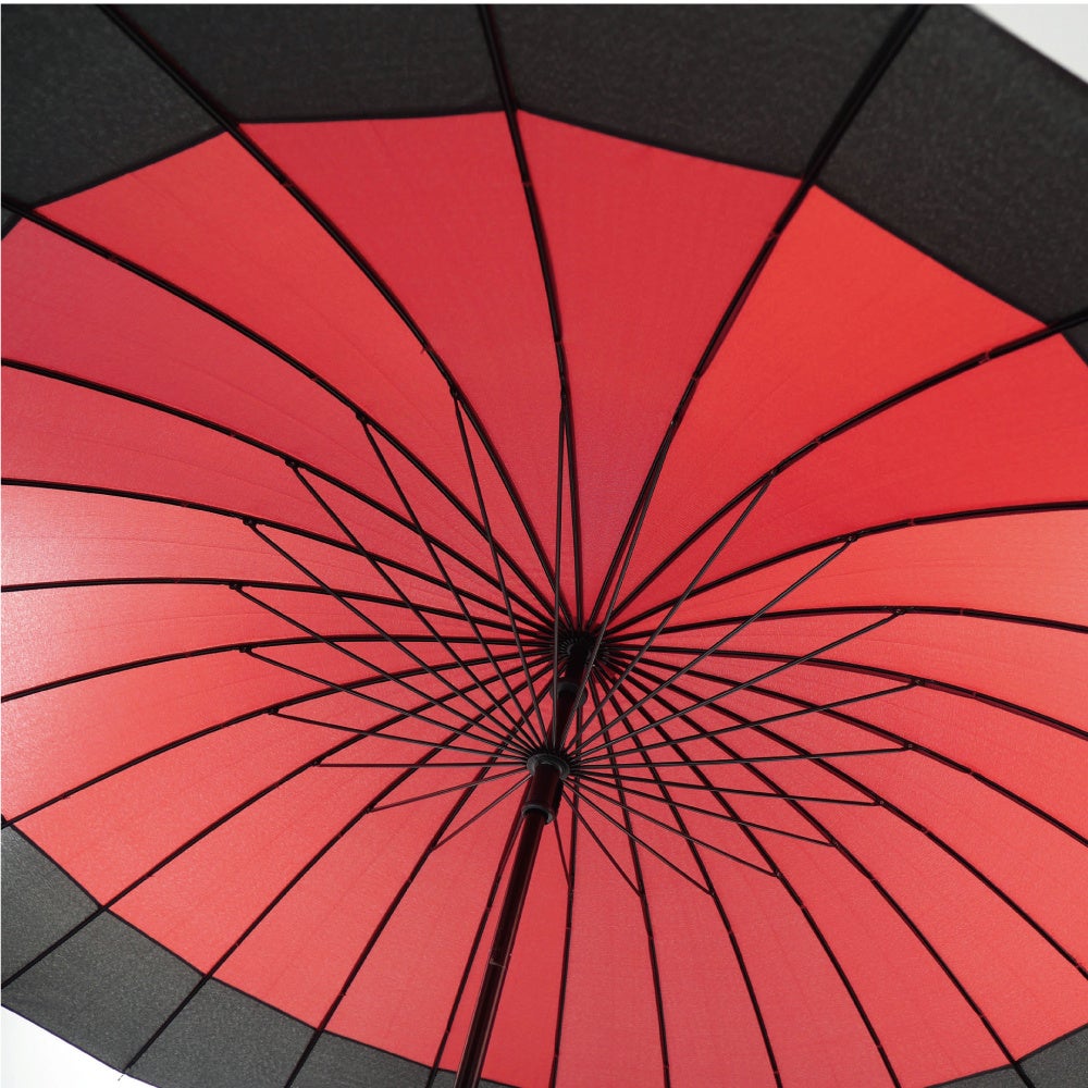 24本骨の傘は骨数が多いため、一般的な8本骨の傘に比べて耐久性があります。また、正円に近いため、同じ60cmサイズでもより多くの面積をカバーでき、濡れにくいのが特徴です。
