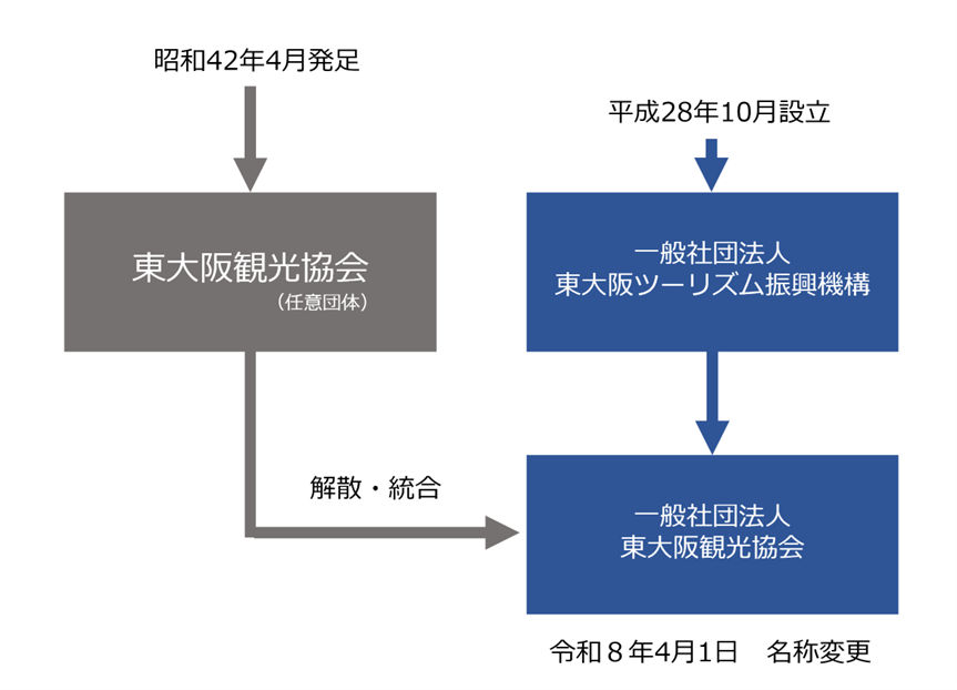 一般社団法人東大阪ツーリズム振興機構および東大阪観光協会は、令和8年4月1日付で組織統合および名称変更を行い、『一般社団法人東大阪観光協会』として新たにスタートいたします。