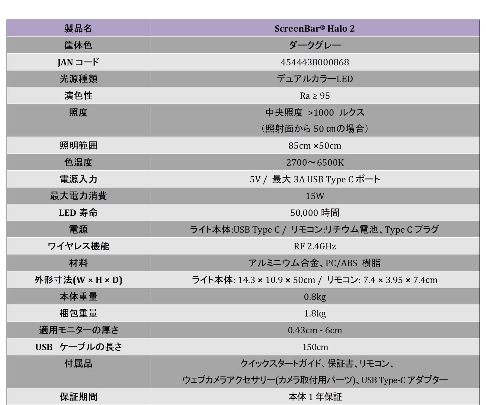 「ScreenBar® Halo 2」製品仕様表