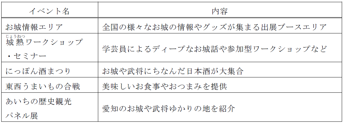 全国の様々なお城の情報や限定グッズが集まる「お城情報エリア」を始め、お城のスペシャリストによるトークショー、武将隊や忍者隊による演武、お食事・おつまみ・地酒の販売など、多くの方に楽しんでいただける内容となっています。