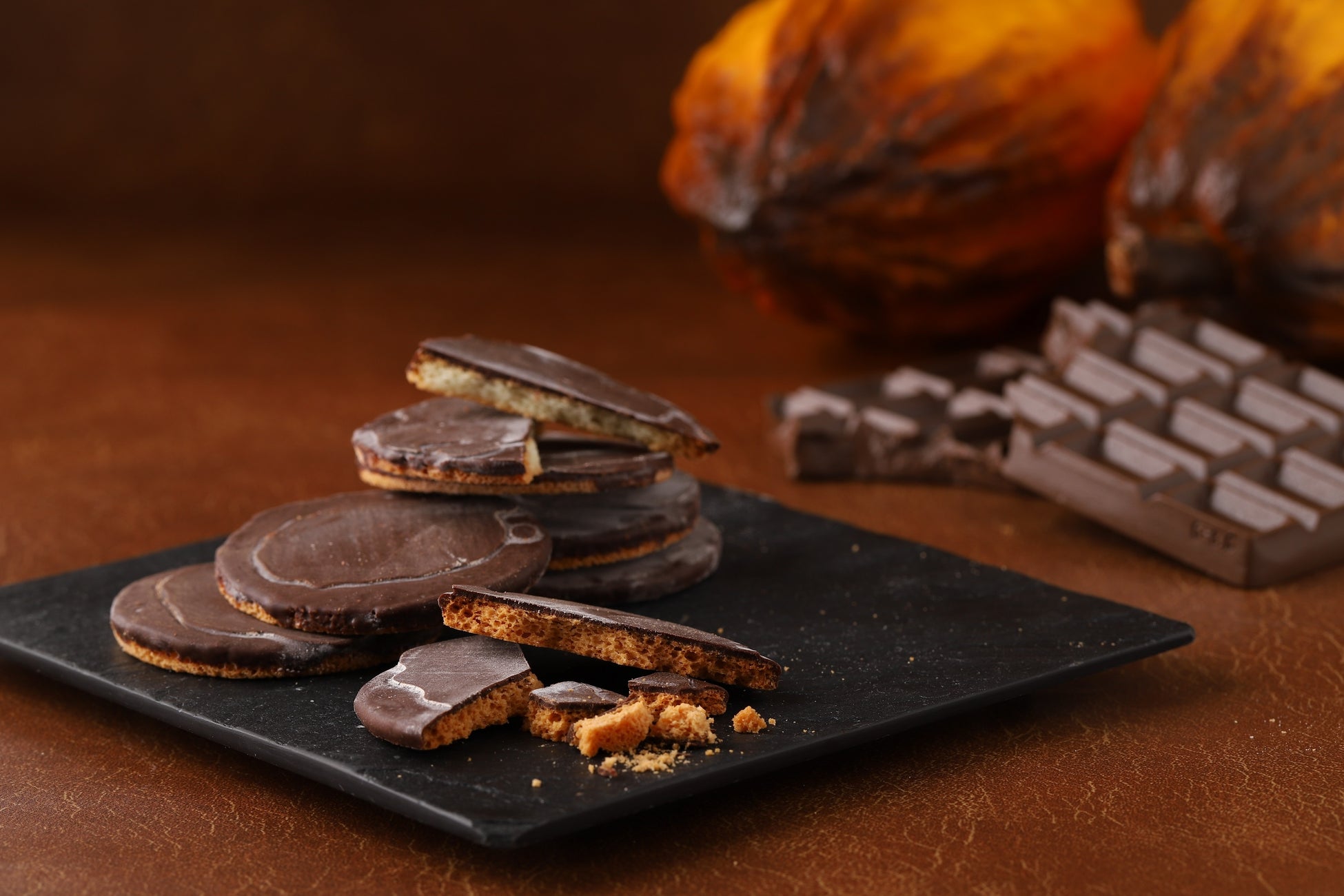 「おせんべいやラスクのような感覚で気軽に食べられるチョコ菓子」というシェフのアイデアから誕生。スポンジ生地をラスクのように軽く焼いてチョコレートでコーティングしました。口溶けのよいビターなチョコレートと、サクサク食感のラスクが絶妙なハーモニーを奏でます。