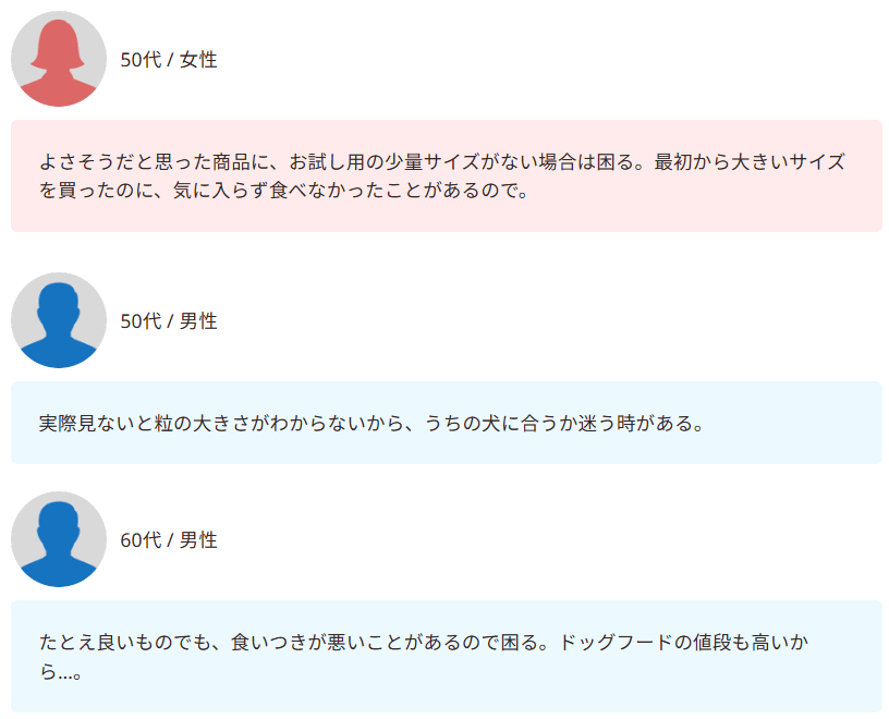 特にお試しサイズがない場合、購入には勇気が要ります。成分の良さ以上に、失敗してお金が無駄になるリスクが、飼い主さんの決断を鈍らせる大きな要因となっています。