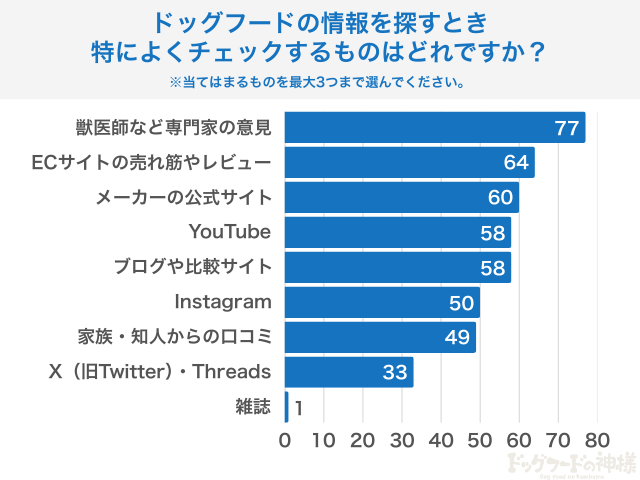 トップは「獣医師やトレーナーなど専門家の声(77件)」となり、通販サイトや公式サイトがこれに続きました。