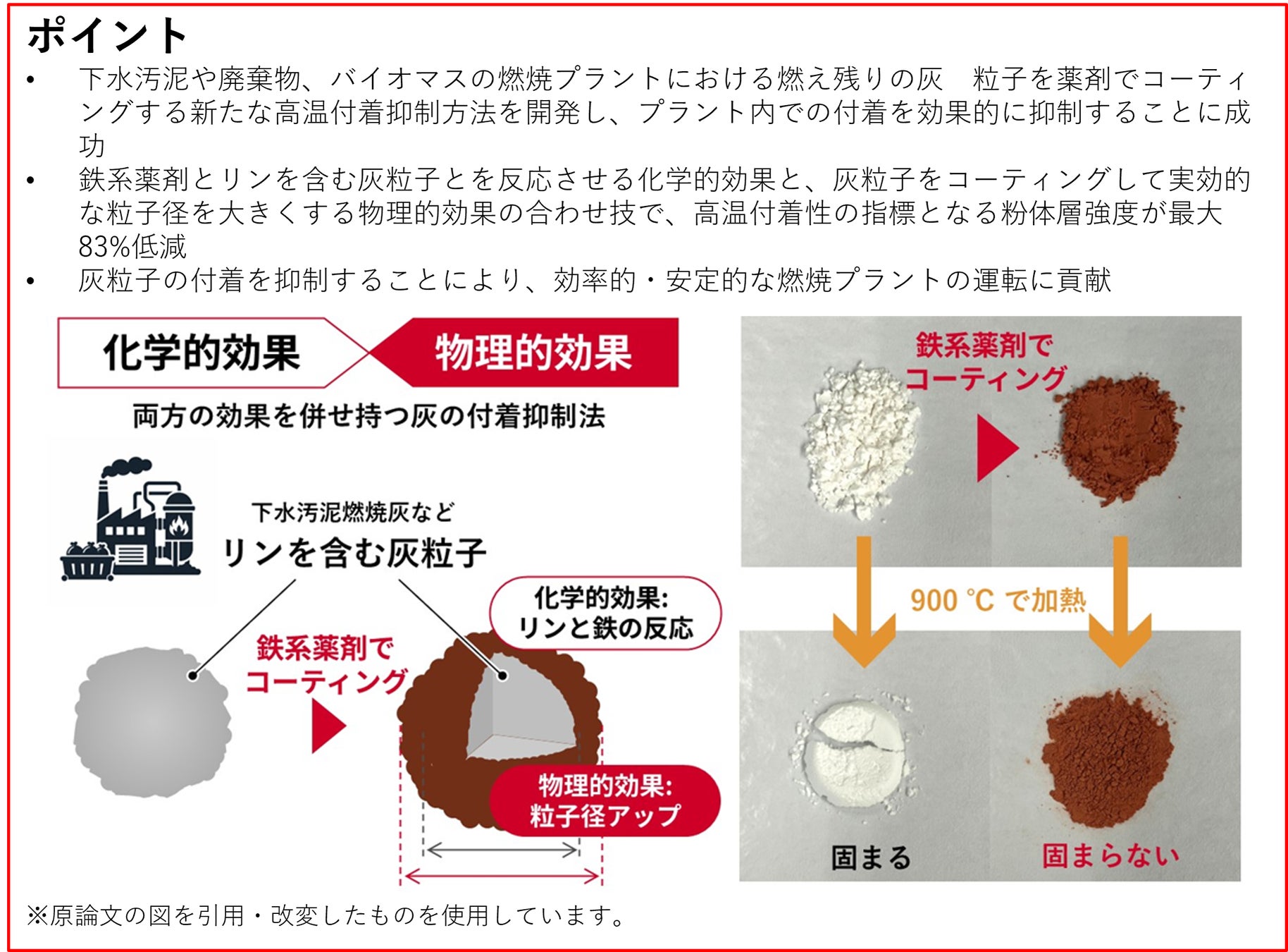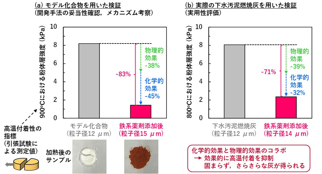 そこで、リンの影響で高い付着性を有することを再現した灰のモデル化合物に対し、化学的・物理的効果が発揮されるよう鉄系薬剤(硫酸鉄水溶液)を鉄添加量が10wt%となるよう、灰を鉄でコーティングしました。添加効果を、上述の粉体層強度測定装置を用いて定量化した結果、900℃における粉体層強度が、薬剤添加しない場合と比べて最大で83%も低下しました(図3 (a))。また、薬剤コーティングによって粒子径が増加したことを確認しました。解析の結果、化学的効果と物理的効果の組み合わせで灰の高温付着性を大幅に抑制できたことが分かりました。さらに、実際の下水汚泥燃焼灰に対しても本手法の実用性を検証しました。実際の下水汚泥燃焼灰はリン以外にもさまざまな成分を含んでおり、カリウムなど一部の成分はリンと同様に付着の原因になることが知られています。検証の結果、リン以外の付着原因が考えられる灰に対しても今回開発した薬剤コーティングによって粉体層強度が劇的に低下することを確認し(図3(b))、実際の燃焼灰にも適用できることを示しました。