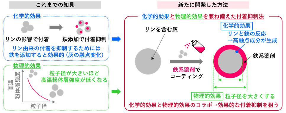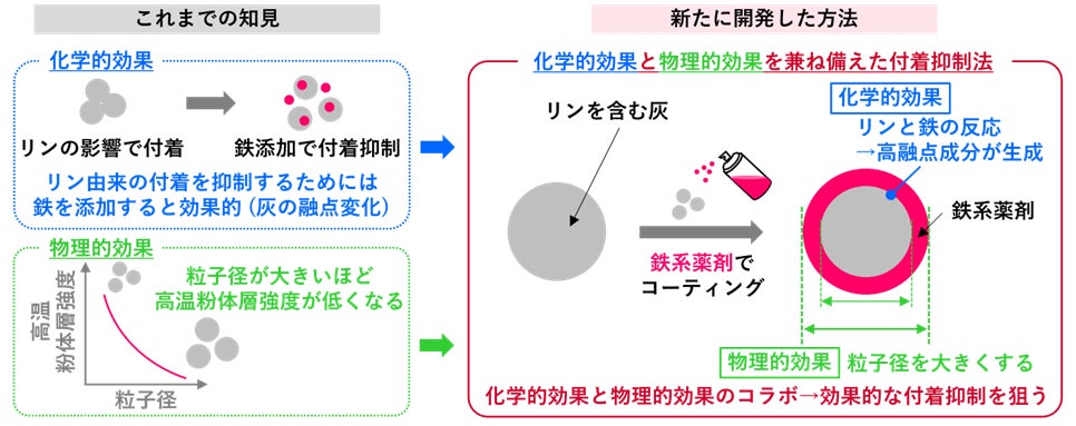 今回、リンが原因となる灰の付着を抑えるために化学的な観点から、薬剤成分として強い効果が期待される鉄系化合物を選定しました。リンと鉄の反応によって、融点の高い成分が生成して灰が融けにくくなります。物理的な観点から、薬剤成分で灰粒子をコーティングし、見かけの粒子サイズを大きくすることを考えました。鉄系薬剤で灰粒子をコーティングすることで、リンと鉄の反応による化学的な付着抑制効果と、粒子径増加による物理的効果の相乗効果により、優れた付着抑制効果が発現すると考えました(図2)。