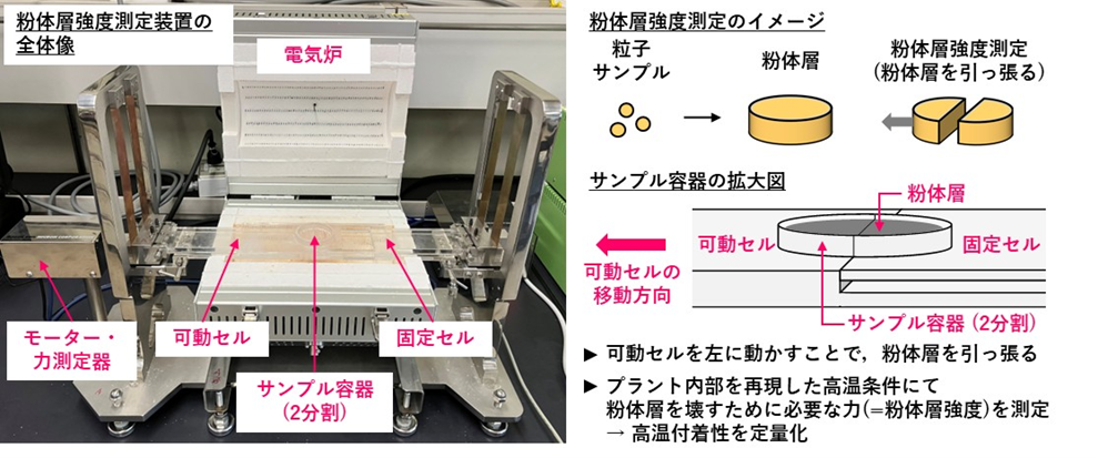 本研究は、高温(500~900℃)条件で灰粒子の付着を抑えることを目的としています。付着抑制効果を判定するためには、粒子の付着性を高温条件で評価することが必要不可欠ですが、定量的な評価手法はほとんどありません。研究グループは、高温条件で粒子の付着性を定量化できる独自の粉体層強度測定装置を有しています(図1)。この装置では、粒子をサンプル容器に詰めてその集合体(粉体層)の引張強度を測定することで、付着性を定量化しています。測定セルなどの工夫により高温(最高1000℃)条件で強度測定を行うことができるため、高温付着性を定量化できます。