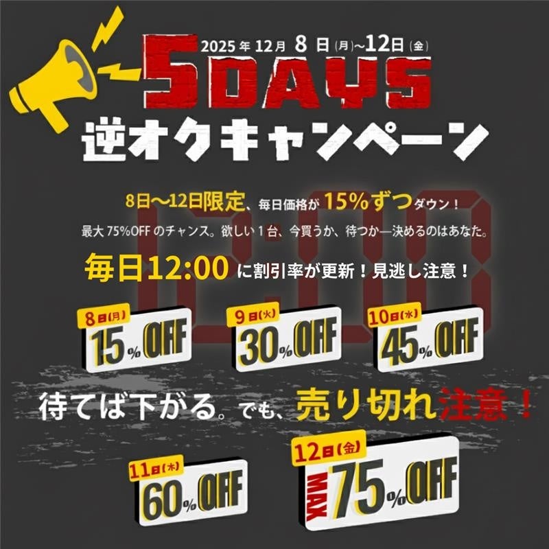 リユースPC事業を展開するリングロー株式会社(本社:東京都豊島区、代表取締役:碇敏之、以下「リングロー」)は、PC卸売ECサイト「Shii:Re(シーレ)」にて、2025年12月8日(月)~12日(金)の5日間限定で、日を追うごとに割引率が上昇する特別セール企画「5DAYS逆オクキャンペーン」を開催します。