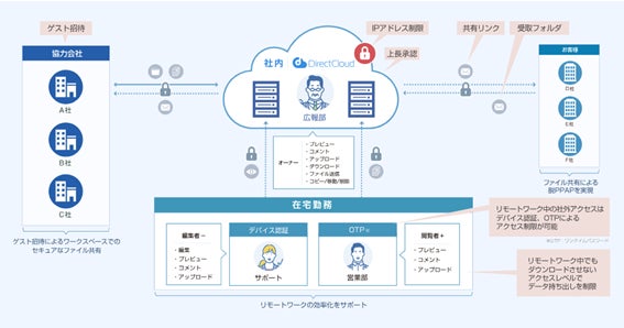 「DirectCloud」では、脱PPAP・ファイル共有・リモートワークといった様々なお悩みを解決し、安全で快適な作業を実現します。
