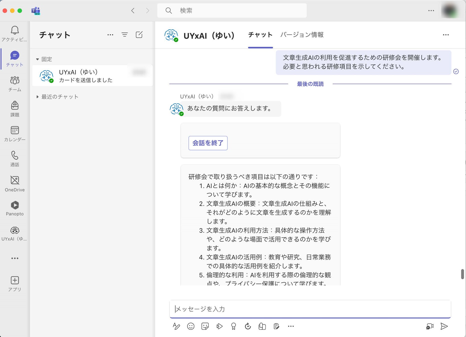 山梨大学様専用のTeams Chatbot 「UYxAI(ゆい)」です。山梨大学関係者のみ利用可能なTeams 用カスタムアプリの提供を行う方法で環境を提供しました。Teams の基本機能であるチャット機能で他の人とチャットをするように、UYxAI(ゆい)に対して質問や指示依頼ができます。