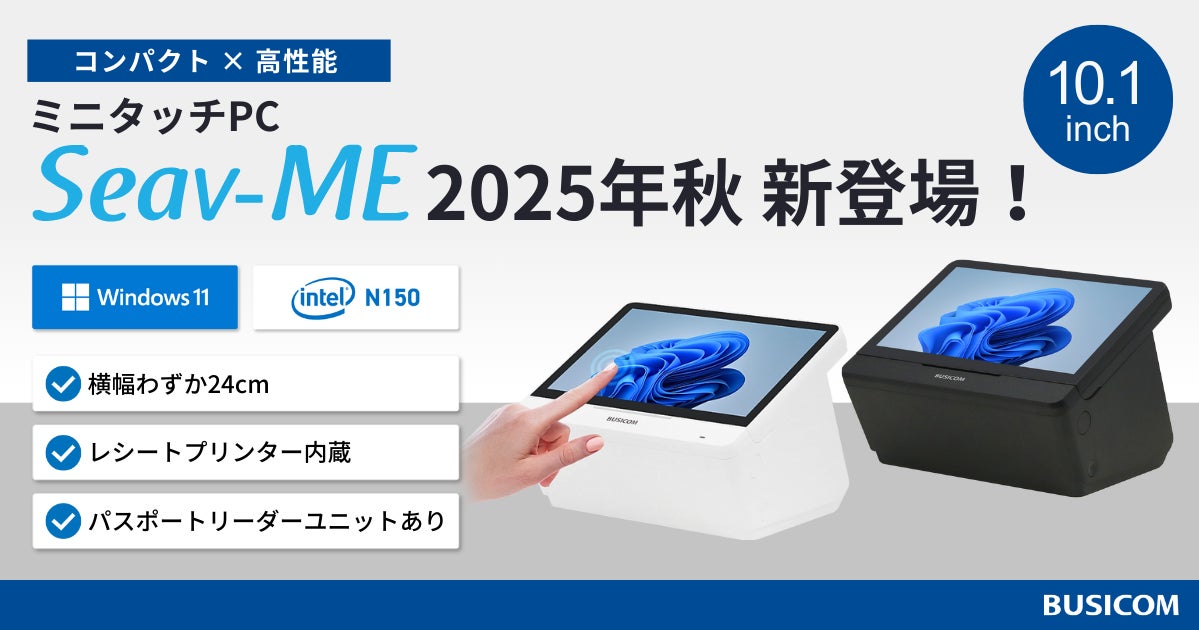 株式会社ビジコム(本社:東京都新宿区、代表取締役:中馬 浩)は、10.1インチのミニタッチPC『Seav-ME』を2025年秋に発売いたします。幅わずか244mm、奥行200mmのコンパクトな筐体に、高性能なIntel N150プロセッサーと内蔵プリンターを搭載。さらに、企業向けに最適化されたWindows 11が安定した動作を支え、限られたカウンタースペースでも、多機能かつスマートな運用を可能にします。免税にも1台で対応できるPOSレジ端末や、セルフチェックイン機、発券機など幅広いシーンで活躍する次世代の業務用端末です。