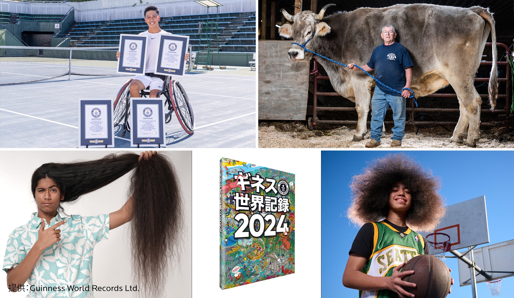 年鑑本『ギネス世界記録2024』日本語版では、今年、車いすテニスで次々と最年少記録を打ち立て、世界をあっと言わせた小田凱人選手、ギネス世界記録公式インスタグラムで紹介され375万いいねを獲得するなど、話題となった日本の中学3年生きらとんの縄跳び8重跳びなど、日本で達成された記録の数々が掲載されています。また、世界からは最長の牛や、中学生男子が伸ばした最大のアフロヘアなど驚きに満ちた記録が紹介されています。