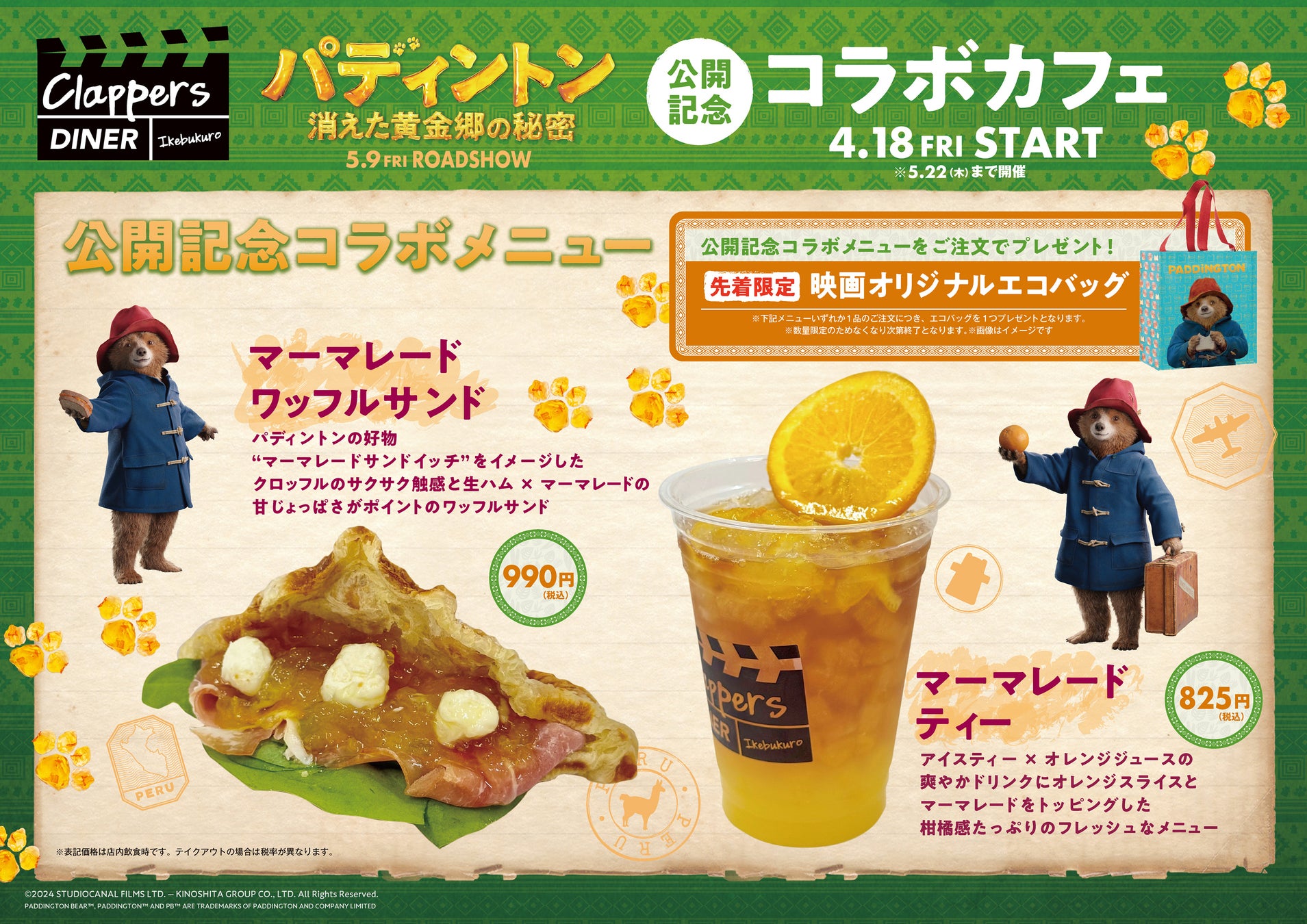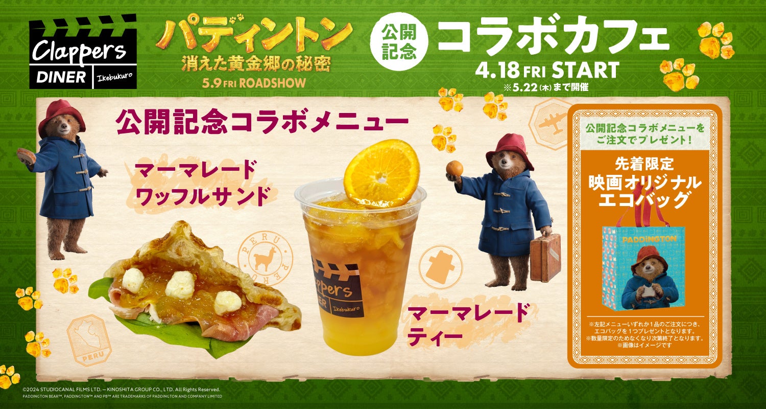グランドシネマサンシャイン 池袋(東京都豊島区東池袋1-30-3)では5月9日(金)『パディントン 消えた黄金郷の秘密』の公開を記念して、4月18日(金)より、劇場内5階にあるカフェ「クラッパーズダイナー」にて公開記念コラボカフェを開催いたします。