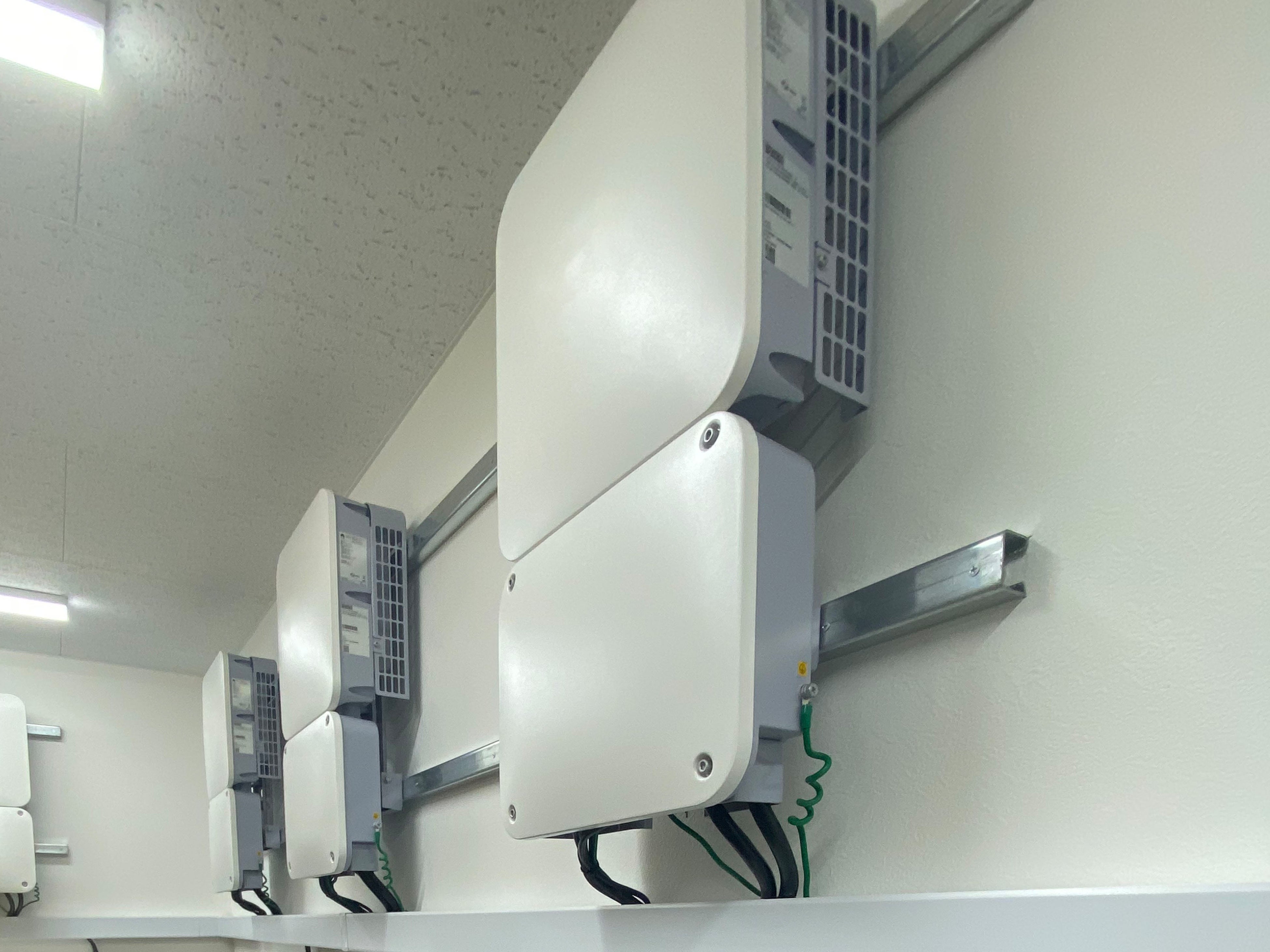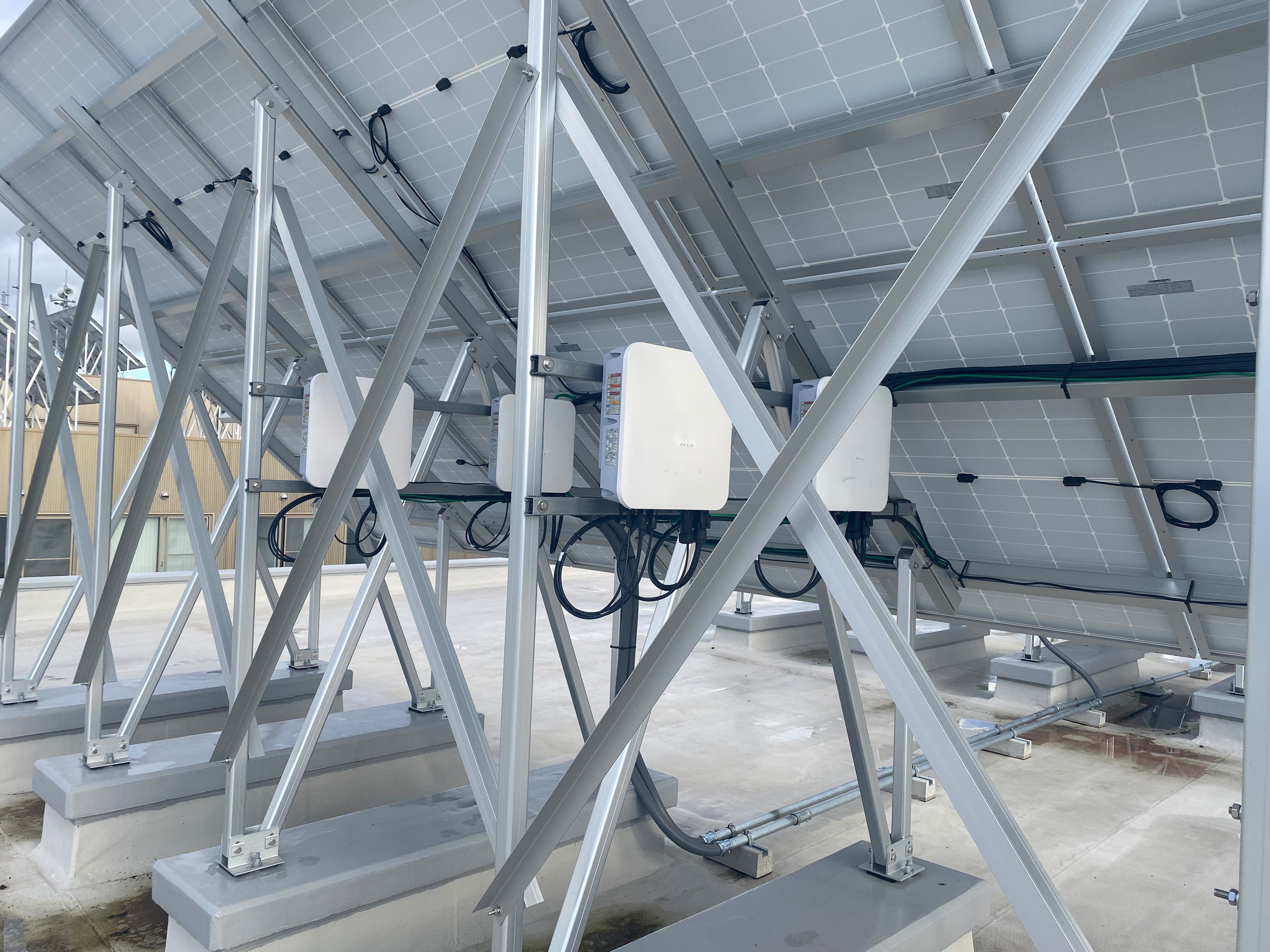今回太陽光発電システムを整備した施設は文化ホールと診療所です。文化ホールには屋上部分に太陽光パネルを設置し、太陽光パネルとともにパワーコンディショナも屋上部に設置しております。診療所は屋上に太陽光パネルを設置し、屋内共用部(蓄電池室)にパワーコンディショナと蓄電池を設置しております。診療所は停電対策として蓄電池を完備しております。