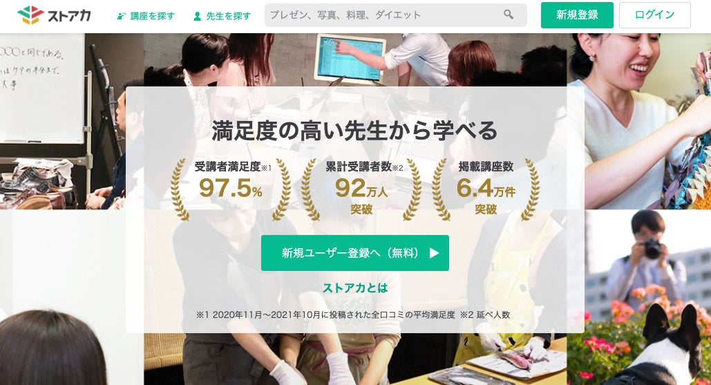 ストアカは、教えたいと学びたいをつなぐまなびのプラットフォームです。学ぶ方には趣味やビジネススキルを対面・オンライン形式で1回から気軽に学べる講座を提供します。また、教える方はサービス上でどなたでも自分のスキルや経験を教える対面・オンラインのセミナーを自由に開催いただけます。オンラインレッスンを手軽に開催できるZoom連携機能や、単発に加えてコース講座や月額サービス機能など、多様なレッスン開催機能・ツールを提供しています。