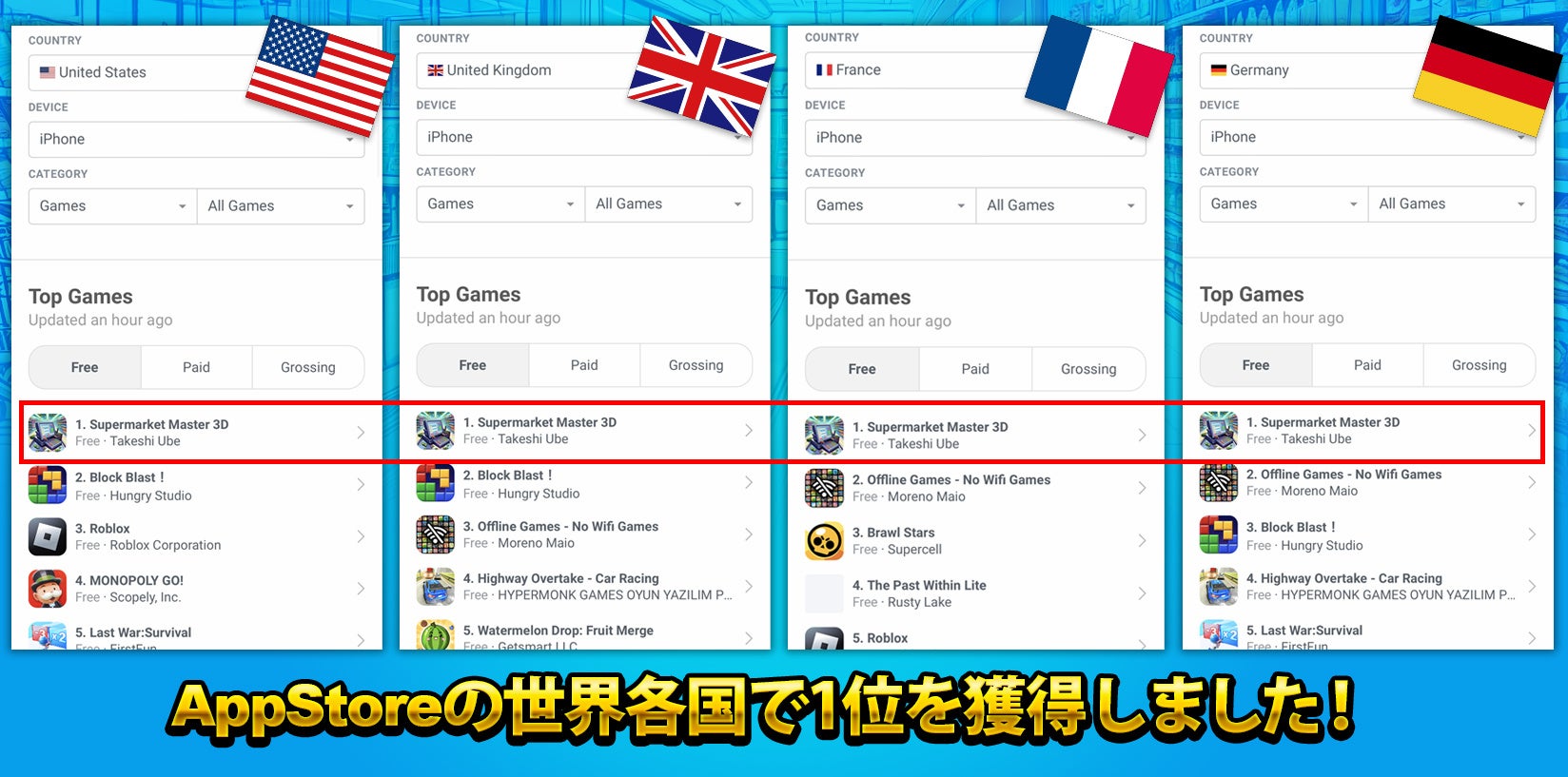 株式会社SVC(本社:東京都品川区、代表取締役:神永明大)は、全世界で展開中のスマートフォン向けハイパーカジュアルゲームアプリ「Supermarket Master 3D」が2024年8月3日(土)時点で、AppStore無料ゲームランキング全米1位(イギリス、ドイツ、フランスでも1位)を獲得したことをお知らせいたします。
