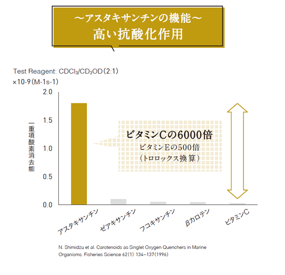 数あるカロテノイドの中でも、アスタキサンチンは「抗酸化力」が非常に強いことで知られており、ビタミンCなどの成分と比較しても、その効果の高さが分かります。