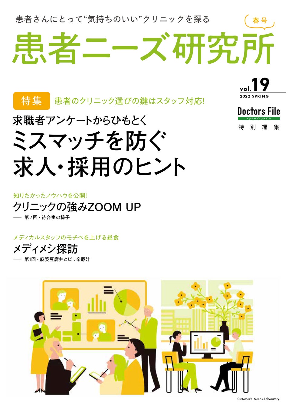 医療機関向けに『患者ニーズ研究所 Vol.19』を発行。特集テーマは、患者のクリニック選びの鍵はスタッフ対応!求職者アンケートからひもとく「ミスマッチを防ぐ求人・採用のヒント」