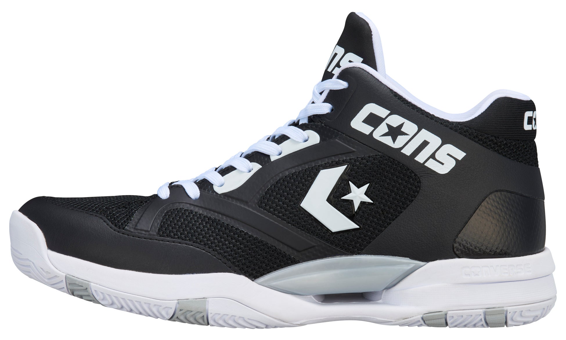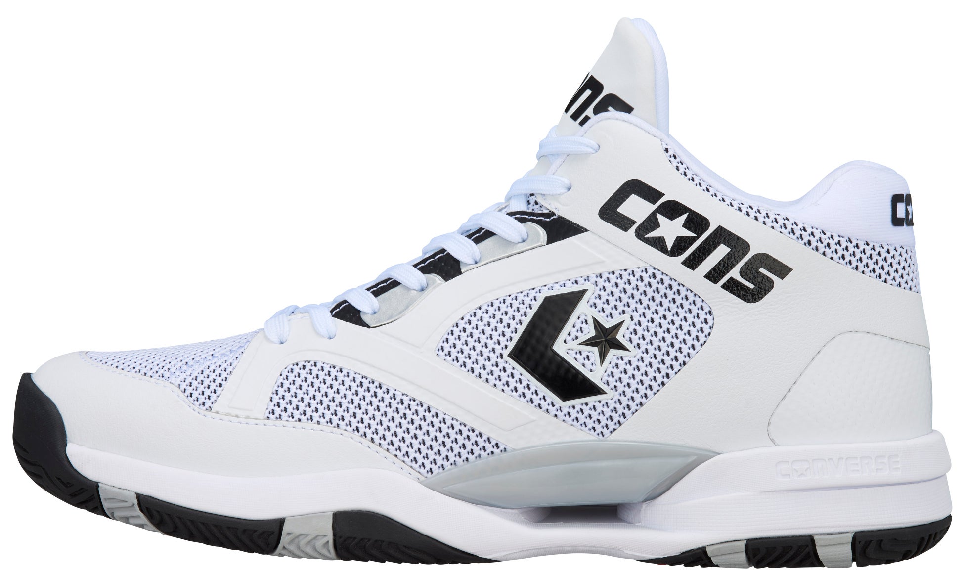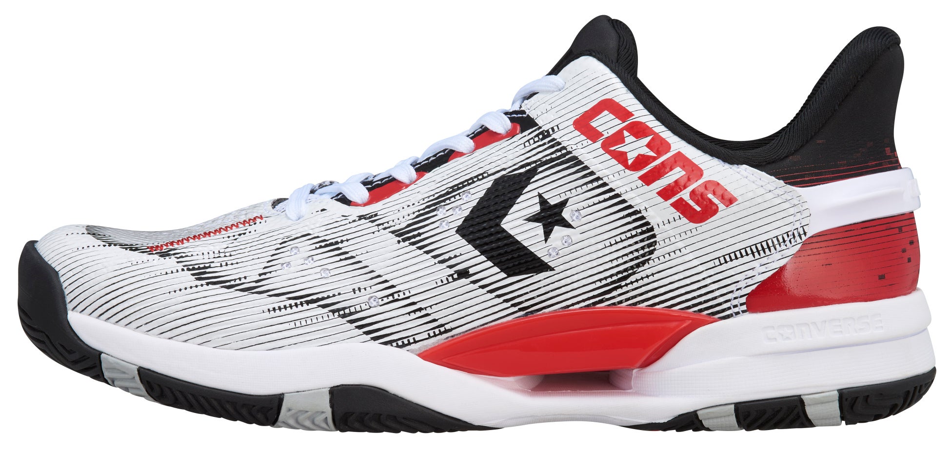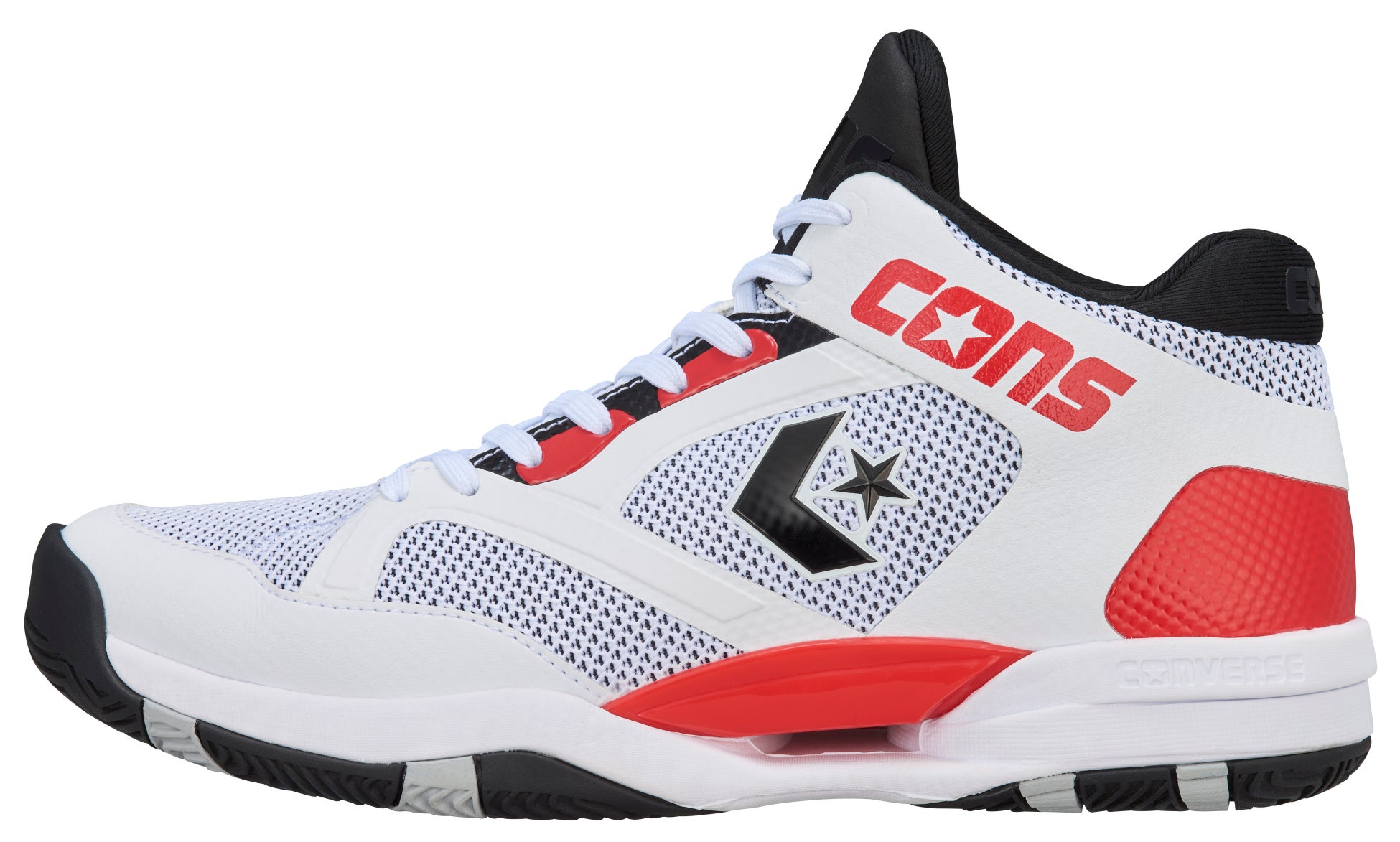 鎧をモチーフにデザインされたミッドソールは、中足~踵部にかけて側壁を高くする事により安定性を確保。さらに、アウトソールは着地安定性、転回の容易さ、荷重負荷にも安定的にサポートができる3つのポイントを兼ね備えた意匠を採用しています。メッシュアッパー、オープンセル構造のPU&E.V.A.カップインソール、踵部の深いウォールカップソール構造を組み合わせた「コンバースバスケットボール」を代表するパフォーマンスモデルです。