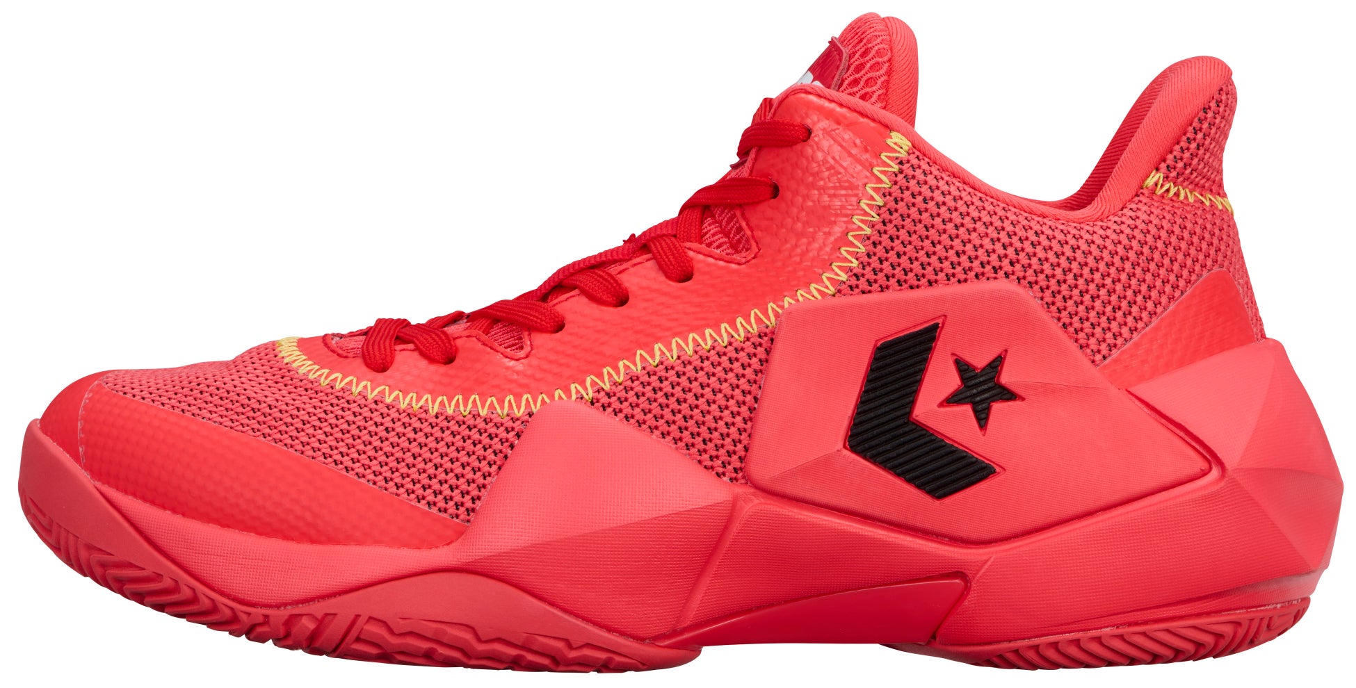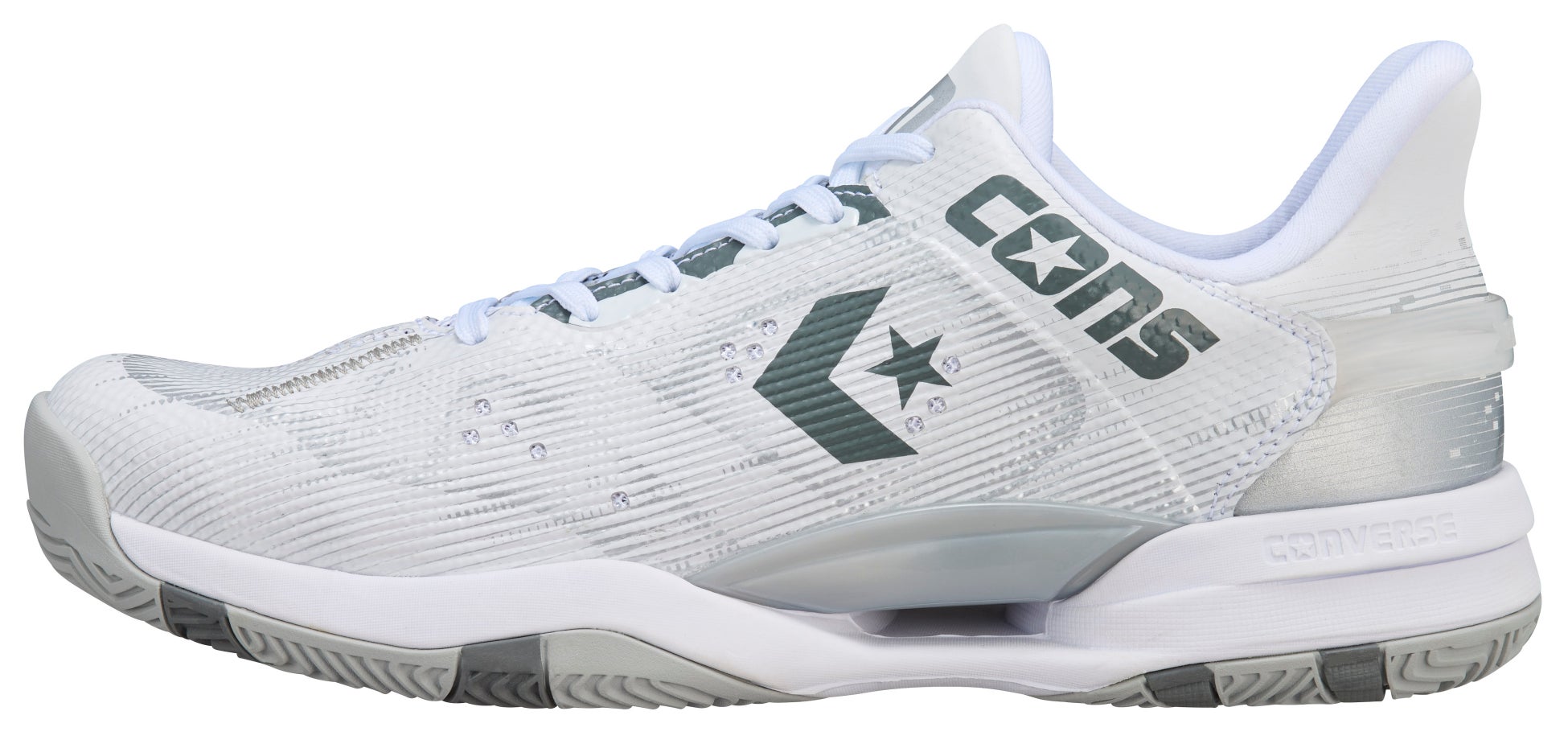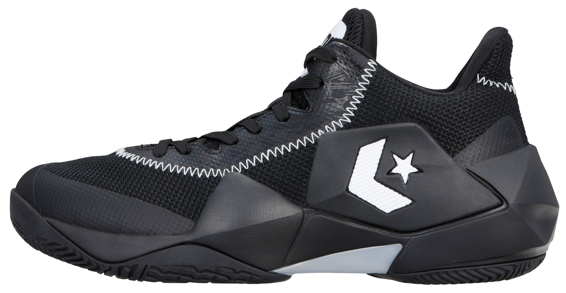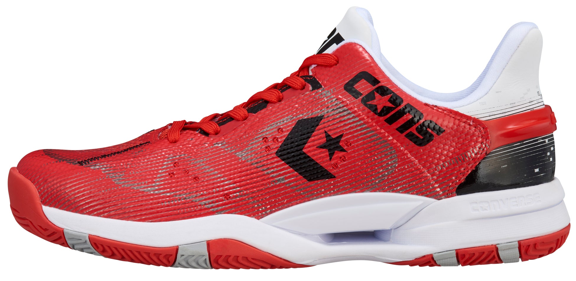 鎧をモチーフにデザインされたミッドソールは、中足~踵部にかけて側壁を高くする事により安定性を確保。さらに、アウトソールは着地安定性、転回の容易さ、荷重負荷にも安定的にサポートができる3つのポイントを兼ね備えた意匠を採用しています。メッシュアッパー、オープンセル構造のPU&E.V.A.カップインソール、踵部の深いウォールカップソール構造を組み合わせた「コンバースバスケットボール」を代表するパフォーマンスモデルです。