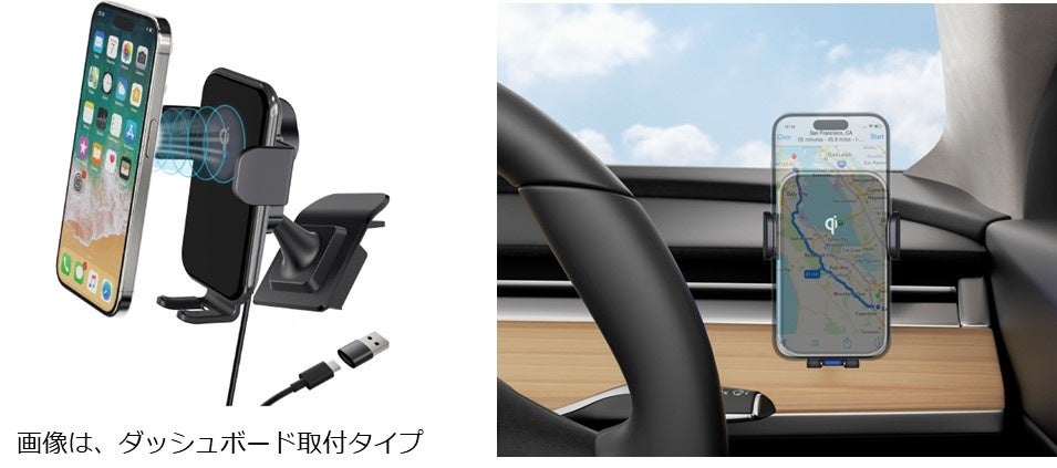 アームが自動で開閉してスマホをホールドし、自動でワイヤレス充電を開始。最大15Wの急速充電(iPhoneは最大7.5W)。Qi規格準拠。両面テープや工具なしで取り付けできます。
