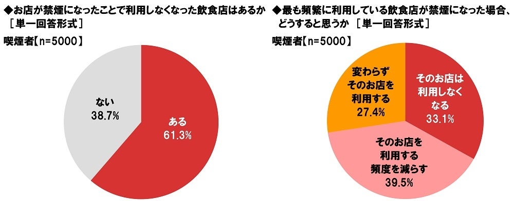 喫煙者(5,000名)に、お店が禁煙になったことで利用しなくなった飲食店はあるか聞いたところ、「ある」は61.3%、「ない」は38.7%と、「ある」が多数を占める結果となった。