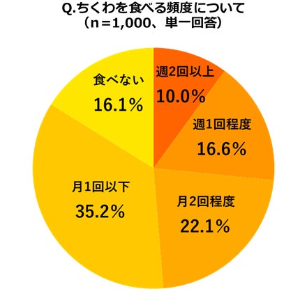 ちくわを食べる頻度について聞いたところ、週2回以上が10.0%、週1回以上が16.6%という結果になりました。