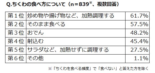 また、普段ちくわをどのように召しあがるかについて聞いたところ、最も多かったのは「加熱調理する」(61.7%)、次いで「そのまま食べる」(57.5%)、おでん(48.2%)と続きました。